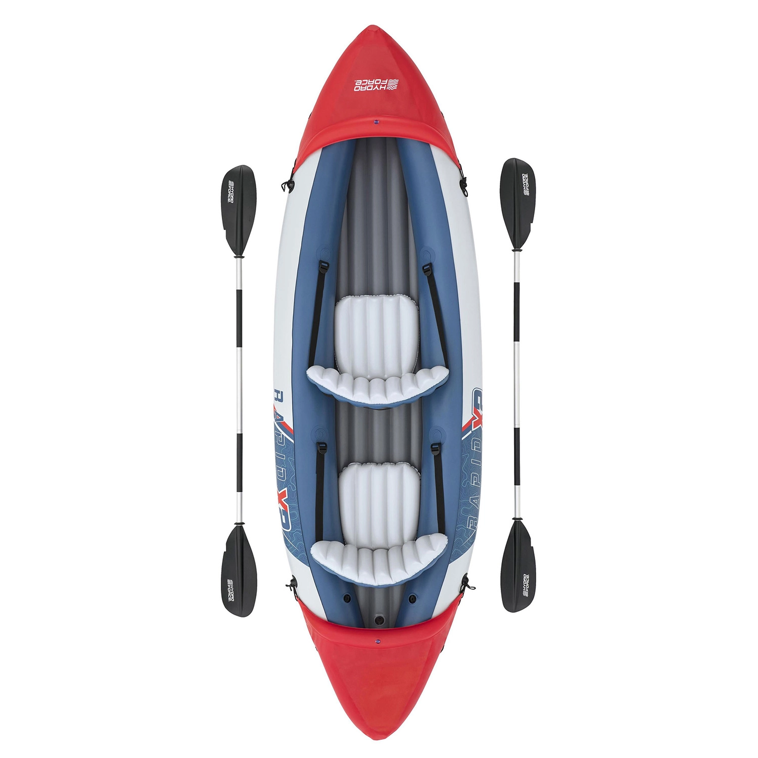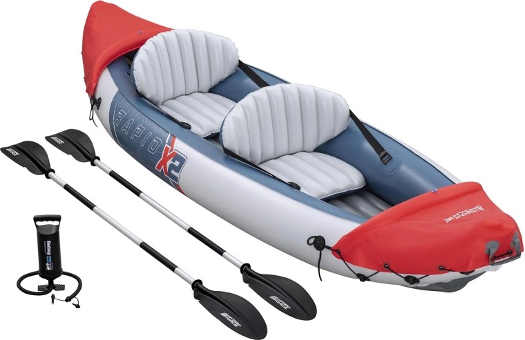 Otkrijte vodene avanture s napuhujućim kajakom HYDRO-FORCE Lite Rapid X2 za dvije osobe. Izdržljiv Inflata‑Shield™ materijal sprječava probijanje, smanjuje rastezanje i poboljšava prianjanje. Kajak nudi čvrsto, napuhujuće dno za stabilnost, 2 uklonjiva napuhujuća sjedala za udobnost, 2 aluminijska vesla, 2 uklonjive peraje za bolje držanje smjera te ručnu pumpu Air Hammer™ i zakrpu za popravak u paketu.