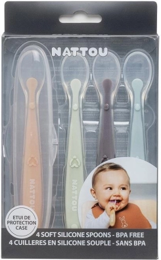 Praktičan set od četiri dječje žličice NATTOU za udobno hranjenje beba i male djece. Zahvaljujući ekstra mekom i fleksibilnom silikonskom vrhu nježne su prema osjetljivim desnima, ergonomske drške olakšavaju držanje, a izdržljiv 100% silikon bez BPA osigurava sigurnu uporabu kod kuće i na putu.