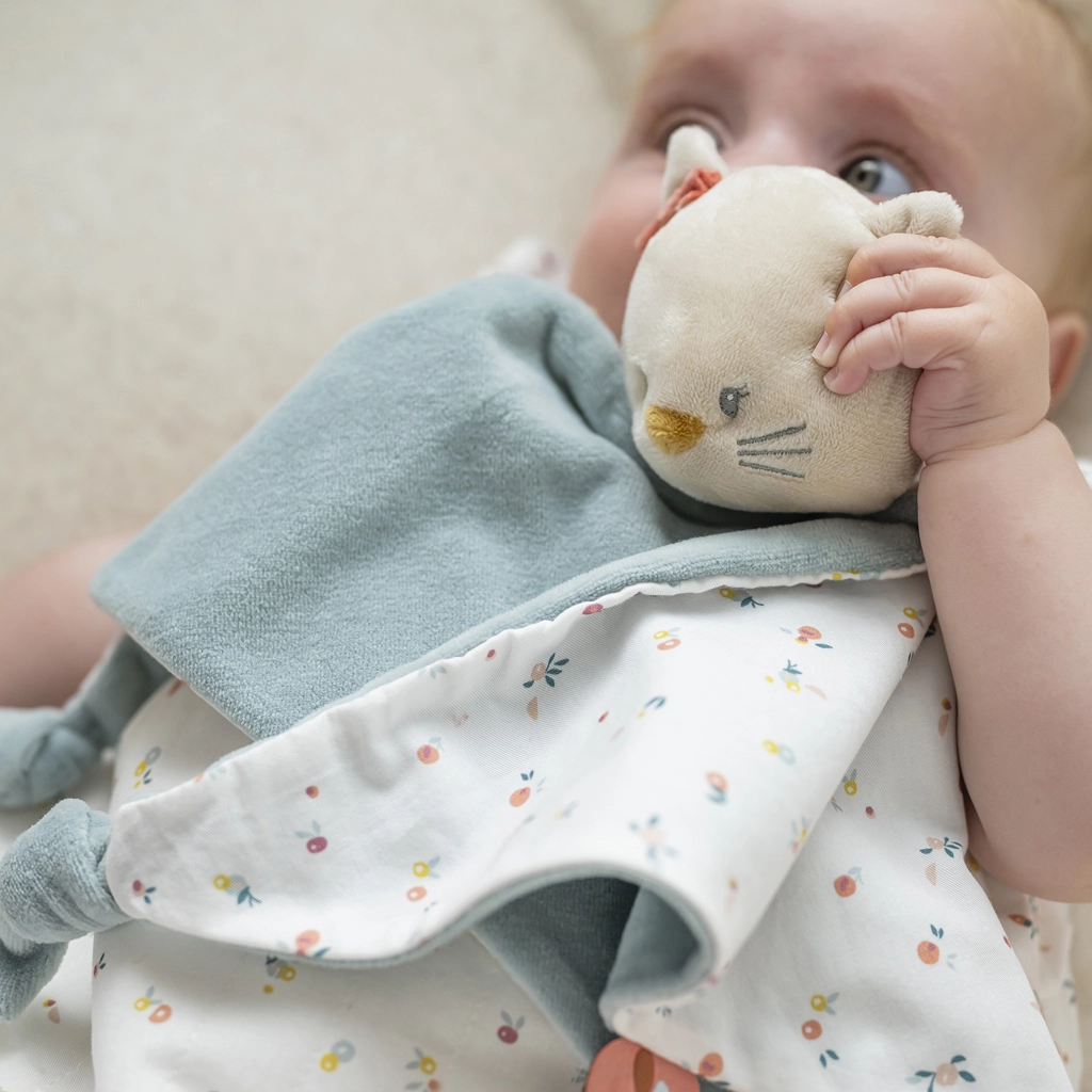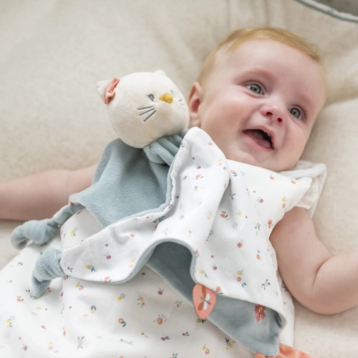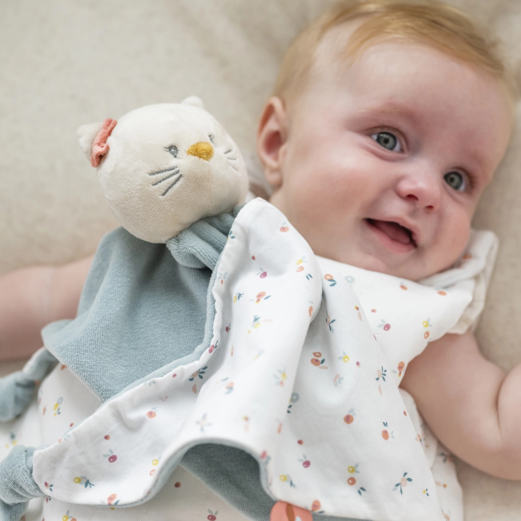 Slatka tješilica mačkica Lana od NATTOU dizajnirana je za udobnost i sigurnost vaše bebe. Mekana kombinacija poliestera i pamuka pruža ugodan dodir, dok čvorići u kutovima i tekstilne etiketice pozivaju na istraživanje i podržavaju finu i grubu motoriku. Praktičan nastavak za dudu drži omiljenu dudu uvijek pri ruci.