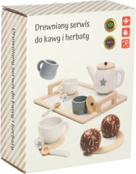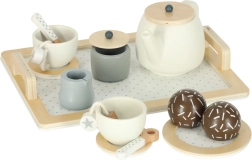 Stilski drveni čajni set za djecu donosi sate kreativne igre i igara uloga. Sadrži poslužavnik, čajnik s poklopcem, šalice sa tanjurićima, posudicu za šećer, vrč za mlijeko, žličice i drvene poslastice. Glatko brušeno drvo je sigurno za djecu i potiče zajedničku igru te razvoj fine motorike.