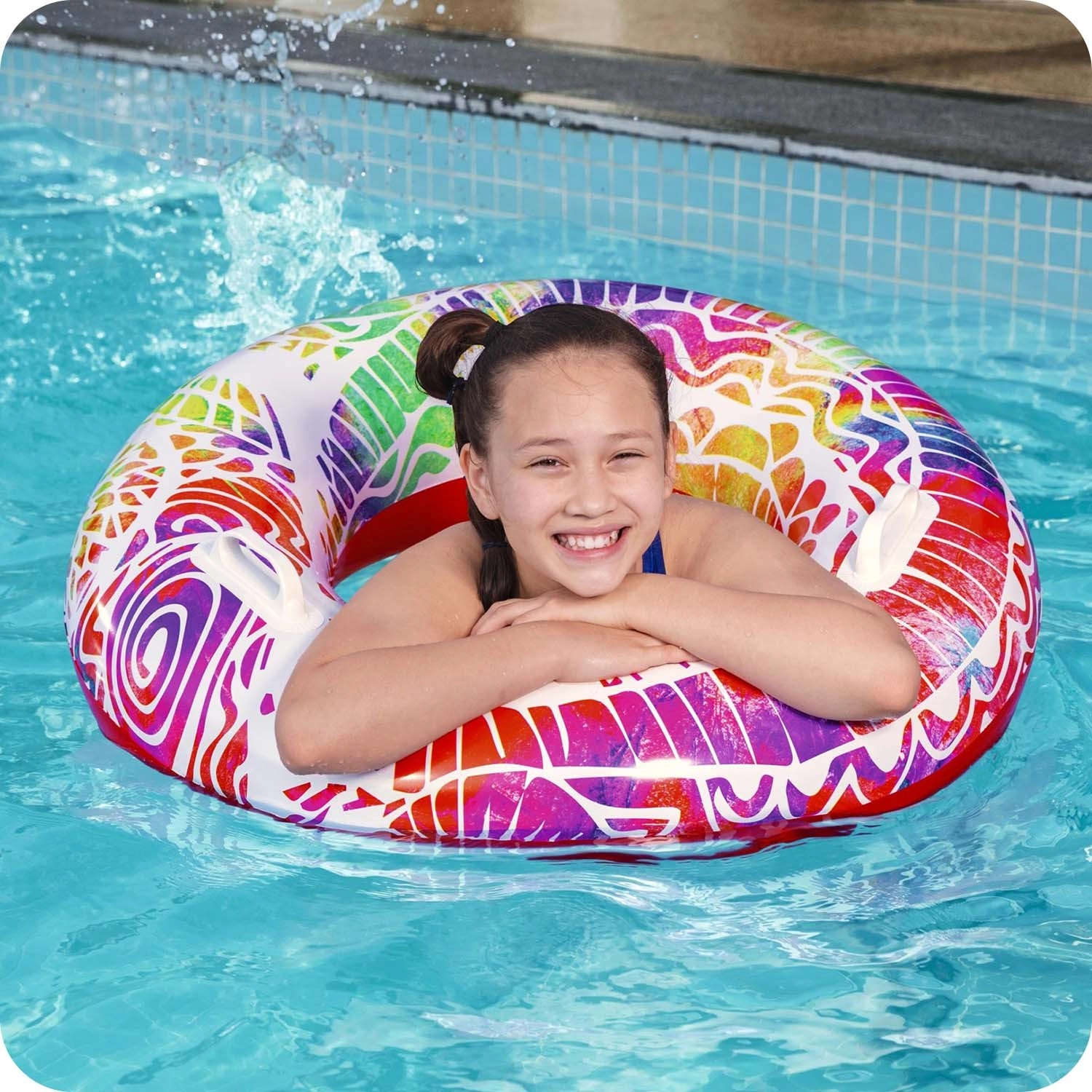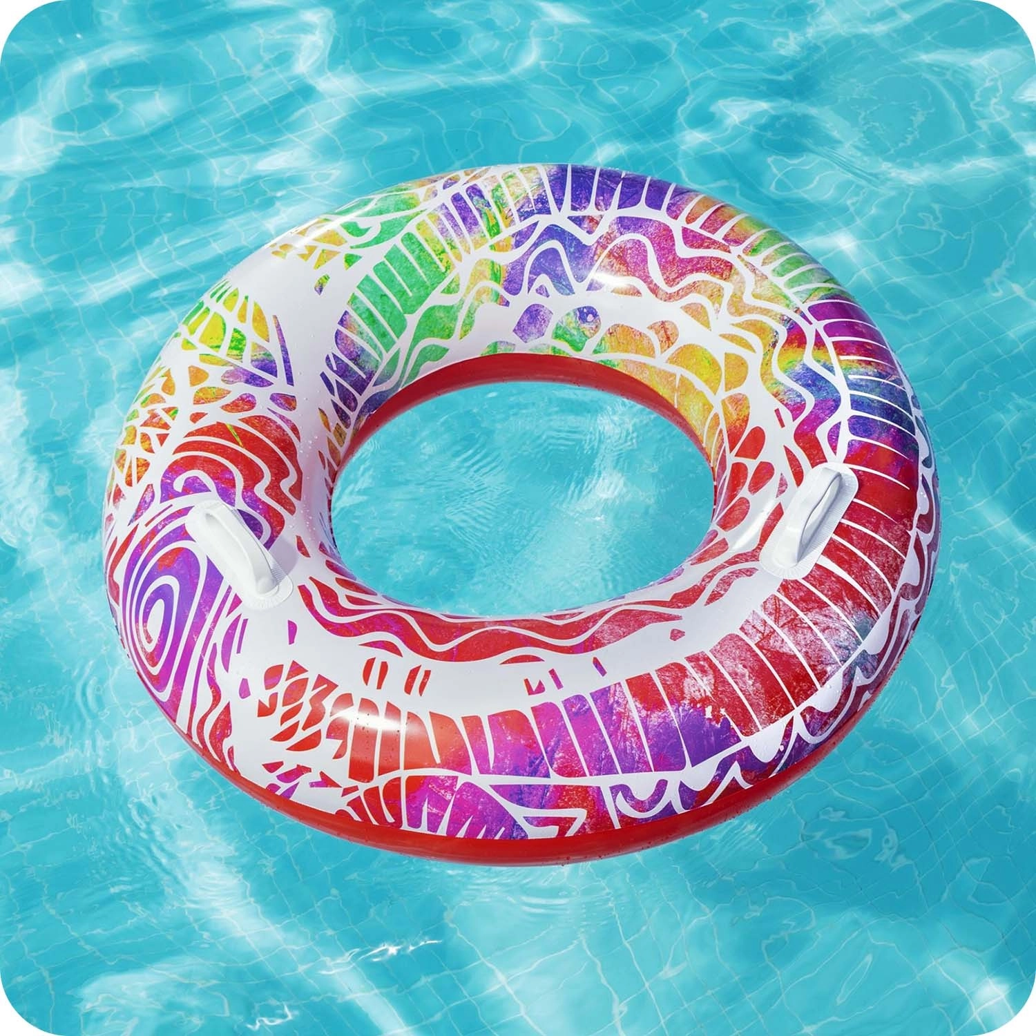 Dvije integrirane ručke povećavaju stabilnost pri sjedanju i tijekom plivanja te ujedno olakšavaju prenošenje. Šareni, upadljivi dizajn izgleda atraktivno na vodi i privlači pažnju na prvi pogled.