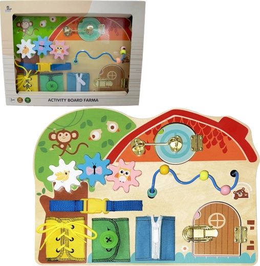 Aktivna ploča s veselom tematikom farme donosi djeci prirodno učenje kroz igru. Životinje, farmerski pribor i razni interaktivni elementi pozivaju na istraživanje, vježbaju prstiće i potiču koncentraciju. Robusna drvena izrada ugodna je na dodir i otporna na svakodnevnu upotrebu.