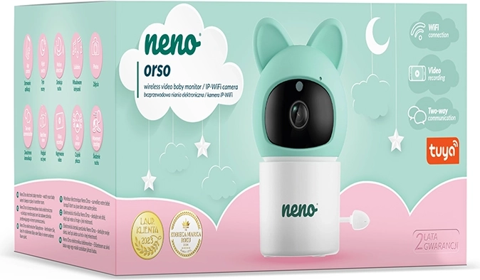 Neno Orso je elegantna IP Wi‑Fi dadilja s rezolucijom 1080p i širokim 120° kadrom, koja zahvaljujući rotirajućoj glavi 355°/55° nadzire cijelu sobu. Noćni način s IR osvjetljenjem osigurava čistu sliku i u potpunom mraku, a dvosmjerni audio omogućuje umiriti dijete na daljinu.