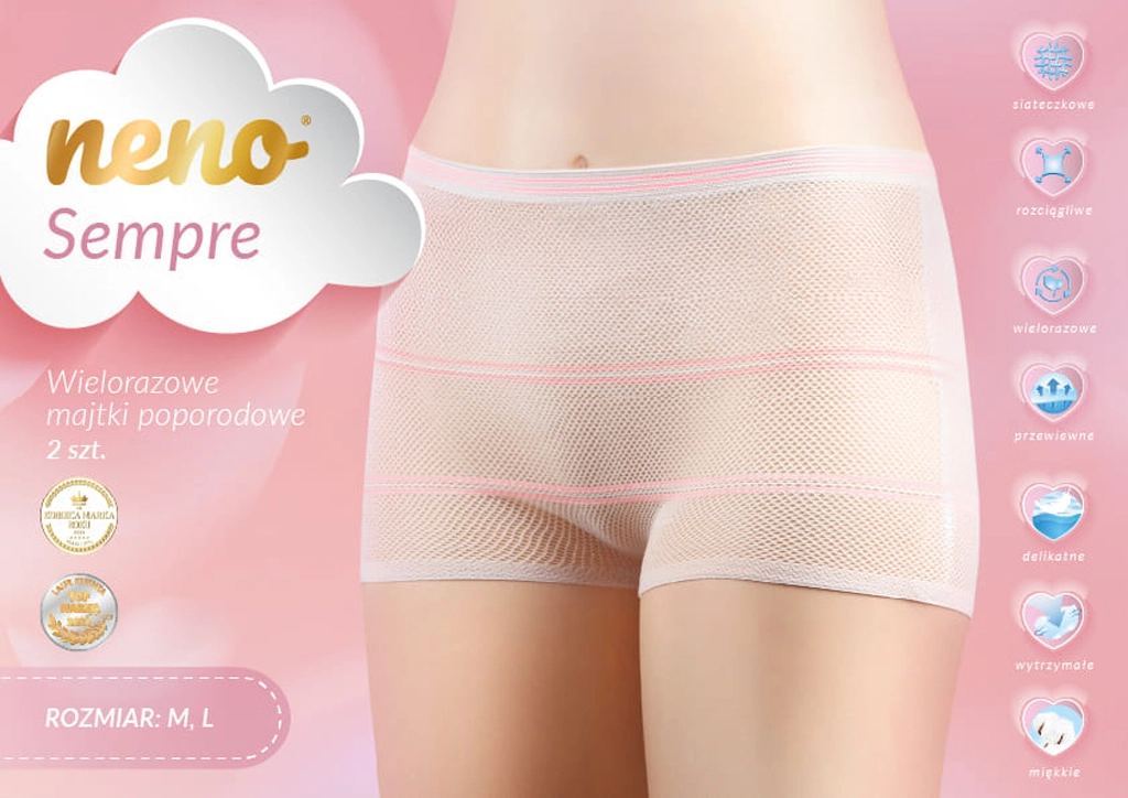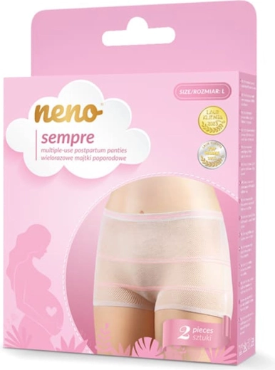 Poslijeporođajne gaćice Neno Sempre su prozirno prozračne, bešavne i blago elastične za svakodnevnu udobnost u razdoblju babinja. Pouzdano drže poslijeporođajne uloške, imaju visok struk za nježno prekrivanje ožiljka nakon carskog reza i mogu se višekratno koristiti kao ekološkija alternativa jednokratnim gaćicama.