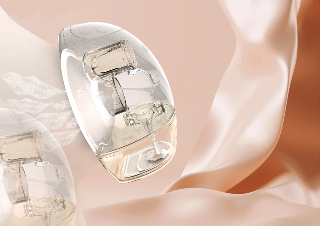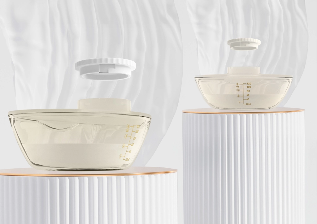 Prsni štit s kutom od 105° prirodno obavija dojku za bolji protok mlijeka. Pregledna skala na posudici olakšava praćenje volumena.