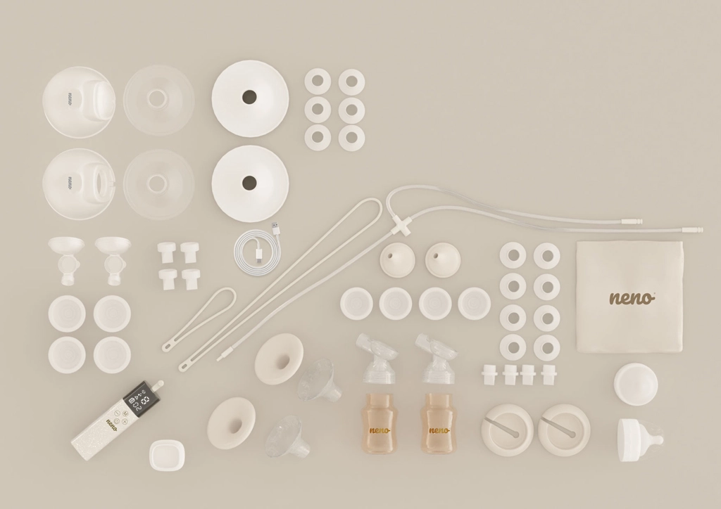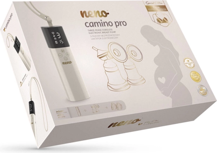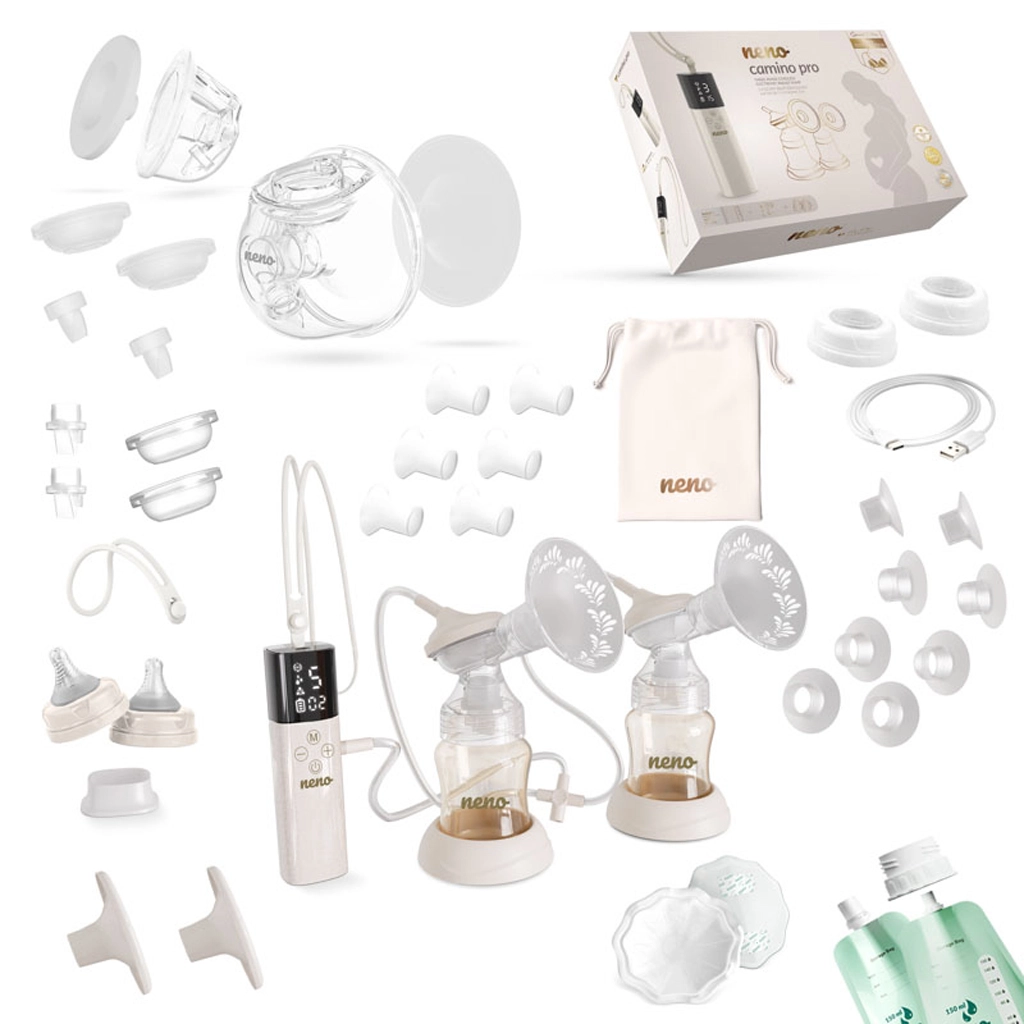 - Izdajalica Neno Camino Pro, stalak, USB‑C kabel, baršunasta torbica, 2× vrećica za mlijeko, 2× ulošci za dojenje, 2× uzice (duga i kratka); set za izdajanje u bočicu (2× bočica 150 ml, 2× poklopac školjke, 2× školjka 24 mm, 2× postolje, silikonska cjevčica, 4× membrana, 4× ventil, 2× priključak, 2× set umetak 15/17/19/22 mm, 2× čep bočice s priključkom); set za hands‑free prikupljanje (2× posuda 240 ml, 2× priključci, 2× poklopci membrana, 4× membrane, 2× školjke 24 mm, 4× ventili, 2× poklopci školjki, 2× setovi umetak 17/19/21 mm)