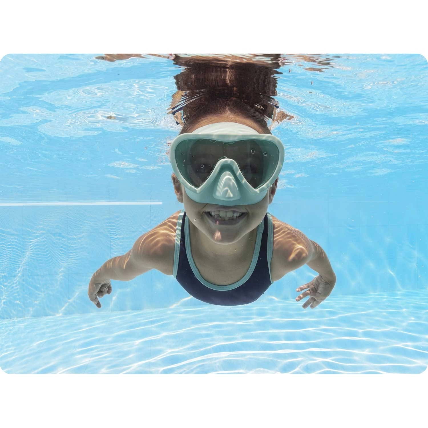 Jednodijelno polikarbonatno staklo s UV zaštitom pruža jasan prikaz i izvrsnu perifernu vidljivost za zabavu u bazenu i pri ronjenju na dah.