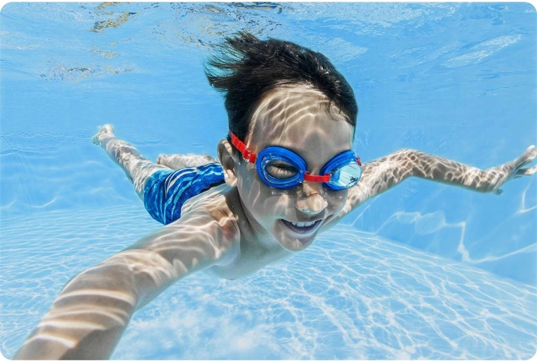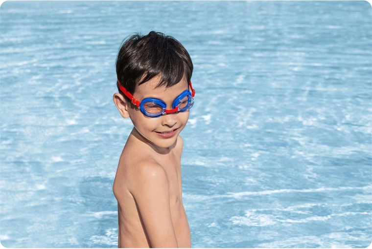 Prozirne hipoalergene leće osiguravaju dobru vidljivost pod vodom, a UV zaštita pomaže zaštititi dječje oči pri plivanju na suncu.