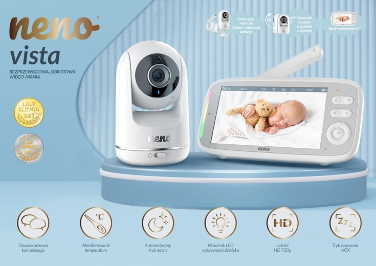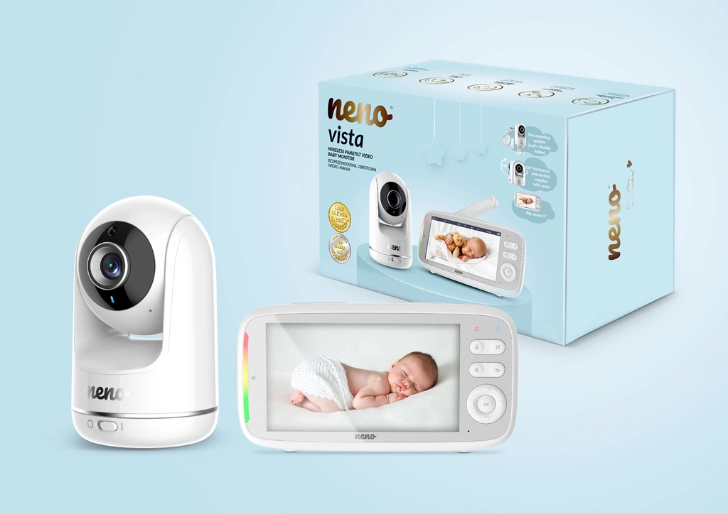 Neno Vista je pouzdan digitalni video baby monitor dizajniran za sigurno i udobno nadziranje djece. Široki 5" LCD zaslon prikazuje čistu sliku u HD 720p kvaliteti, a automatski noćni način s IR LED osigurava jasne detalje i u mraku. Zahvaljujući dvosmjernoj komunikaciji možete umiriti bebu na daljinu, a s VOX načinom zaslon se uključuje samo pri zabilježenom zvuku – tako štedi bateriju i produljuje autonomiju.