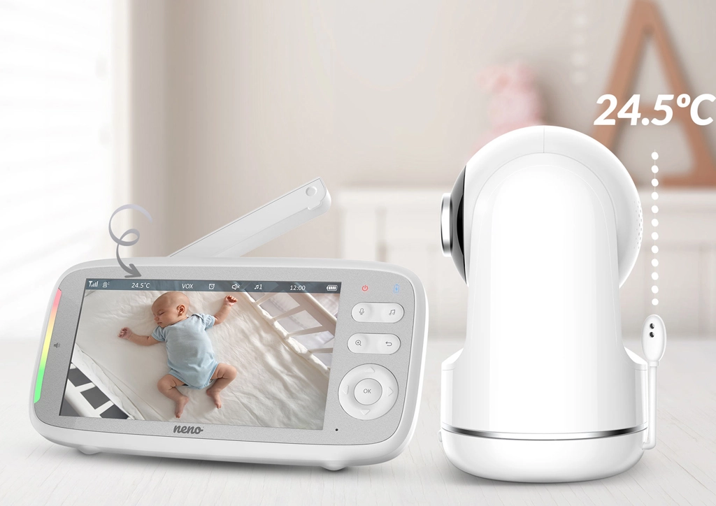 Neka vam je beba pod nadzorom danju i noću s video baby monitorom Neno Vista. Nudi veliki 5" zaslon, HD 720p sliku, noćni vid, dvosmjernu komunikaciju i VOX štedljivi način. Zahvaljujući horizontalnom i vertikalnom okretanju kamere, praćenju temperature i LED indikaciji zvuka imat ćete sigurnost i mir kod kuće i u vrtu.
