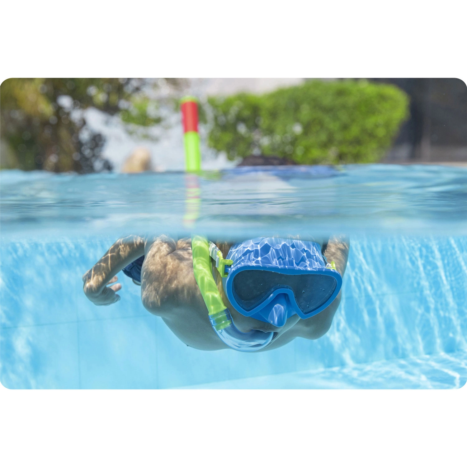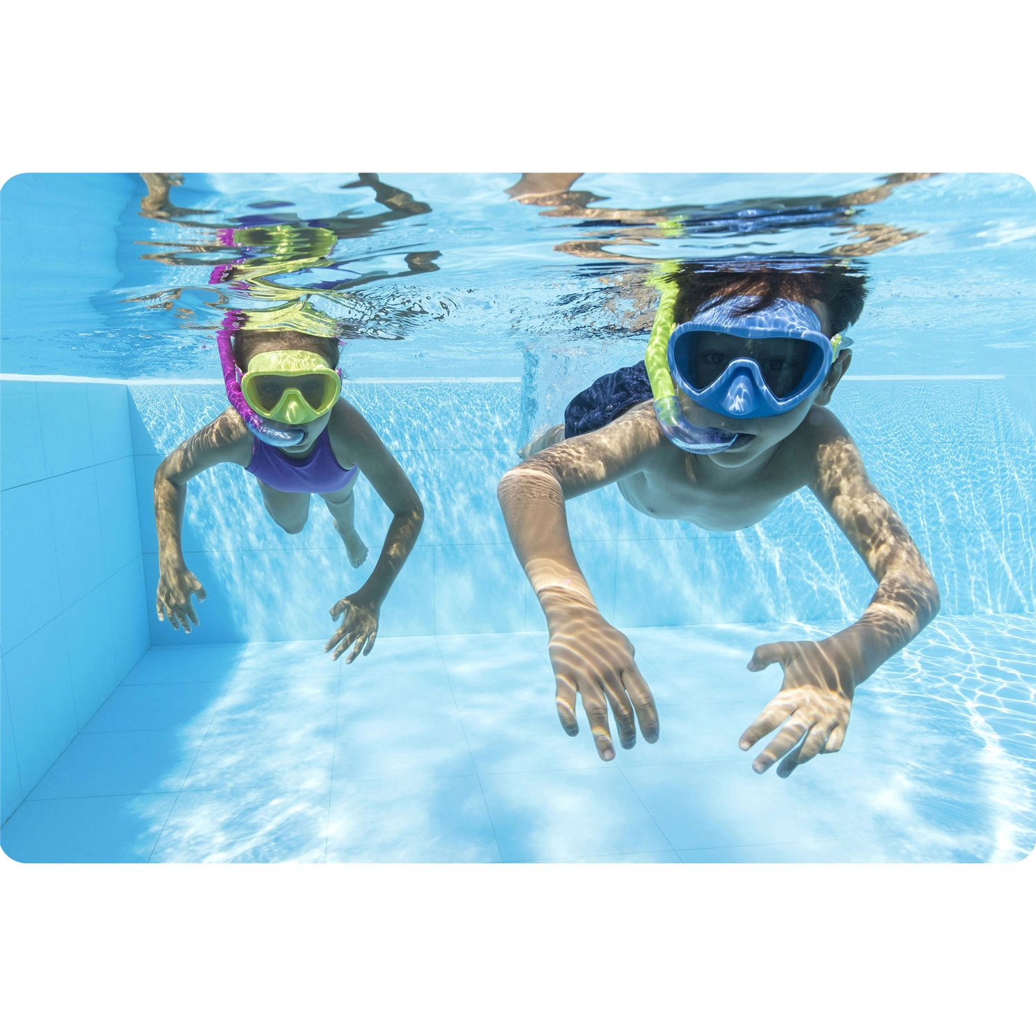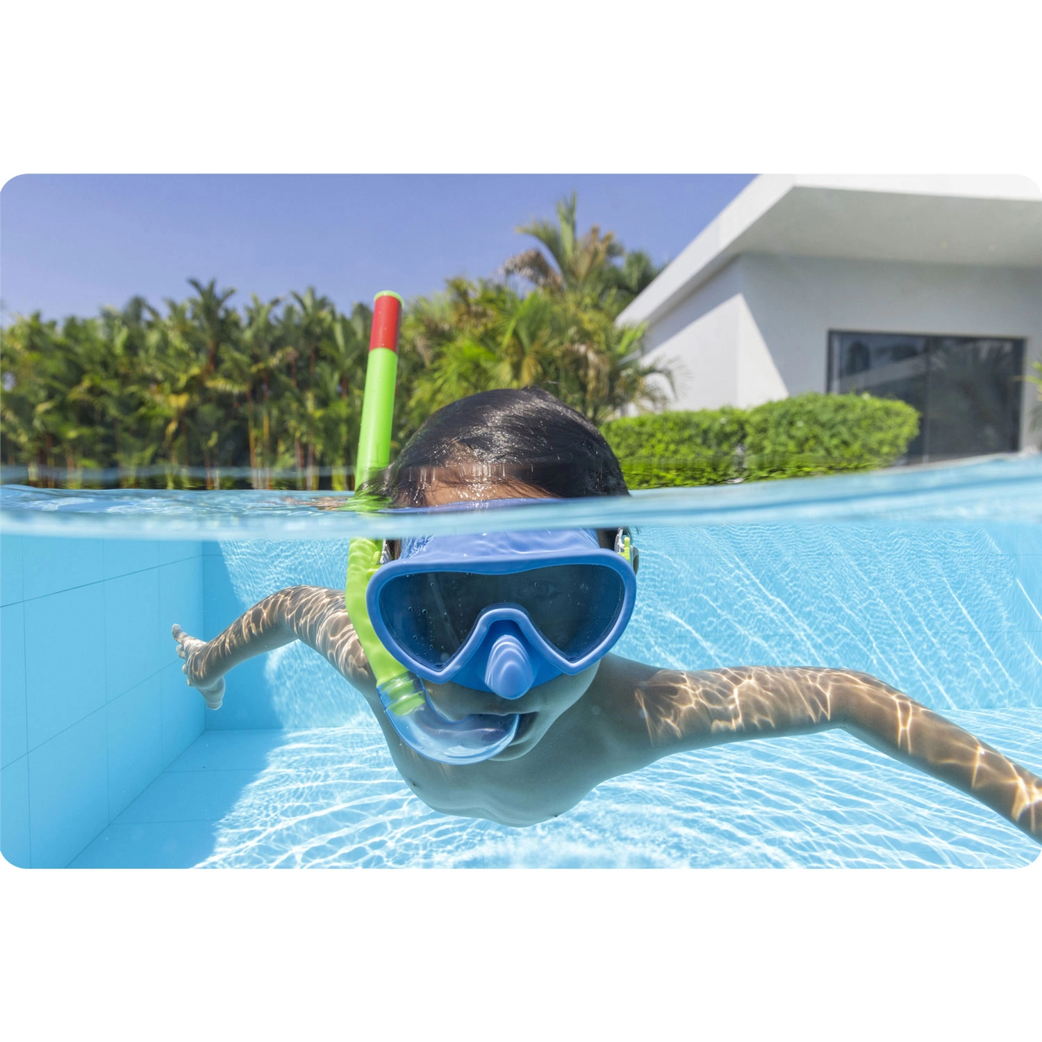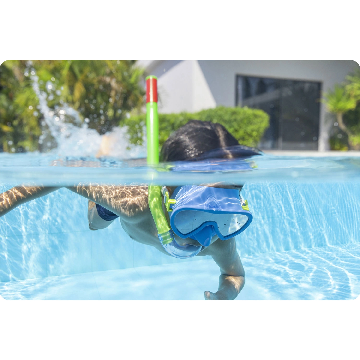 Otkrijte podvodni svijet s udobnim setom za ronjenje na dah Bestway za mlade i odrasle. U kompletu je maska s polikarbonatnim lećama s UV zaštitom, koje pružaju široko vidno polje, te disalica s mekanim silikonskim usnikom i zaštitom od prskanja protiv prodora vode. Podesiva silikonska traka osigurava čvrsto i udobno prianjanje bez propuštanja. Univerzalna veličina, bez lateksa – idealno za bazen i more.