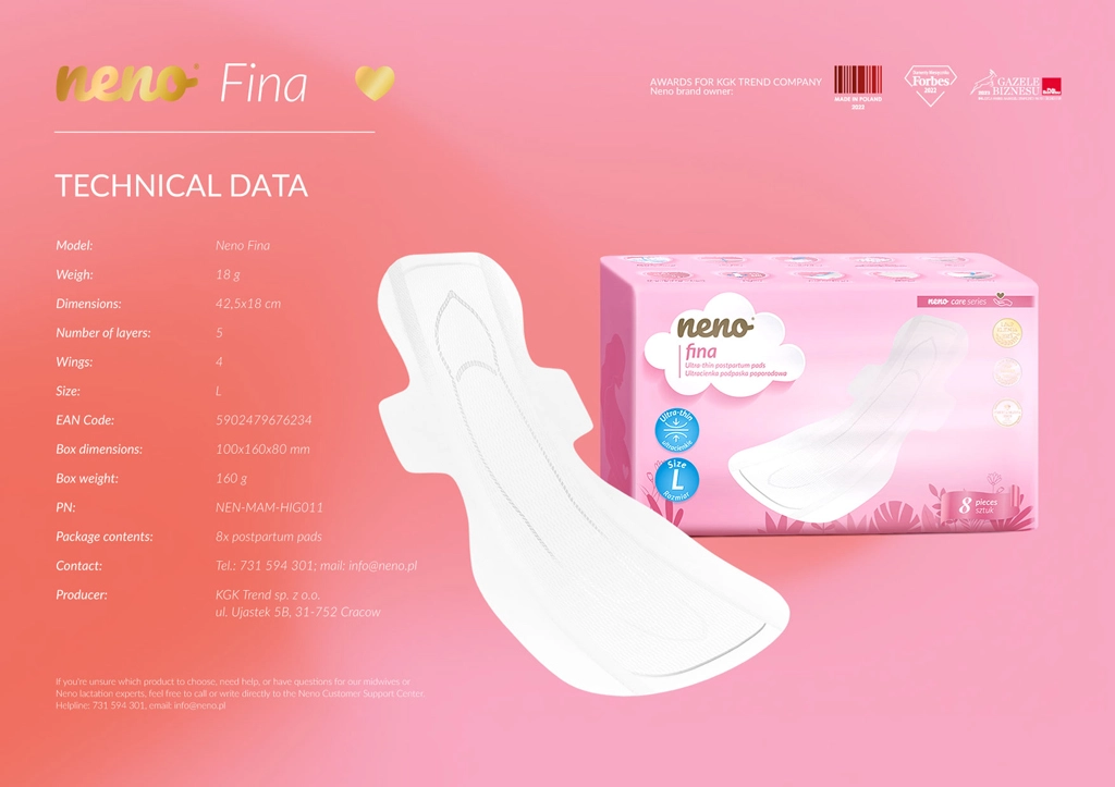 Poslijeporođajni ulošci Neno Fina razvijeni su s naglaskom na udobnost, diskreciju i pouzdanost. Njihova ultra tanka konstrukcija pruža nenametljivu zaštitu, dok visoka upojnost i veća površina 425 × 185 mm osiguravaju sigurnost tijekom cijelog dana. Prozračni materijali pomažu održati kožu suhom i bez iritacija, što je posebno važno u osjetljivom razdoblju nakon poroda.