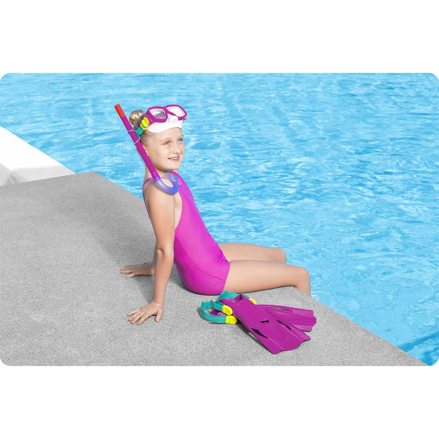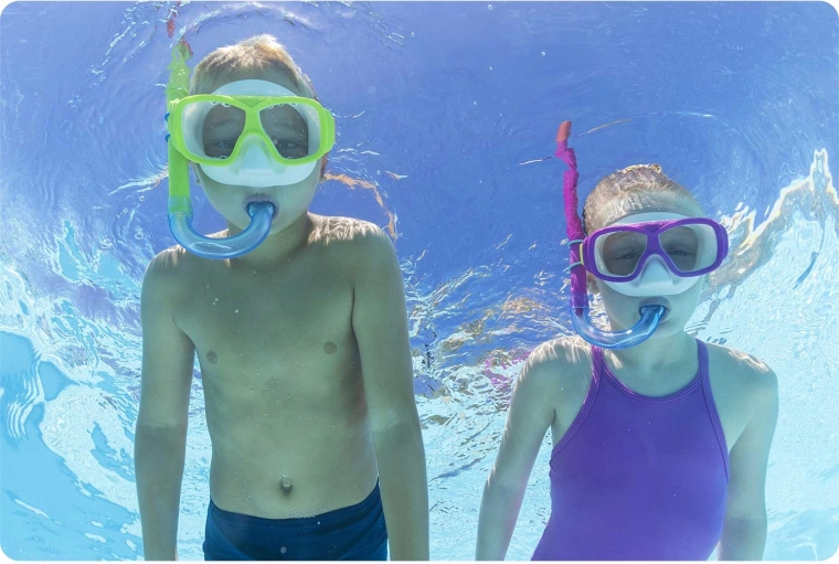 Set BESTWAY idealan je izbor za obiteljski odmor, bazen i more. Maska od kaljenog stakla pruža čist i izdržljiv pogled, dok mekani okvir i podesivi silikonski remen pomažu postići čvrsto i udobno prianjanje na različitim tipovima lica.