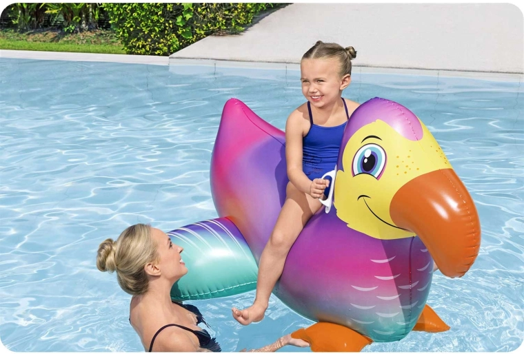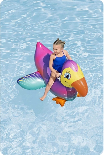 Napuhujući tukan Bestway razigran je i siguran pratitelj za vodene zabave djece od 3 godine naviše. Zahvaljujući velikom tijelu i uravnoteženom obliku iznimno je stabilan, dok čvrste ručke omogućuju udobno sjedanje i držanje tijekom vožnje. Šareni dizajn s izrazitim kljunom zasigurno će privući pozornost na svakom ljetnom odmoru.
