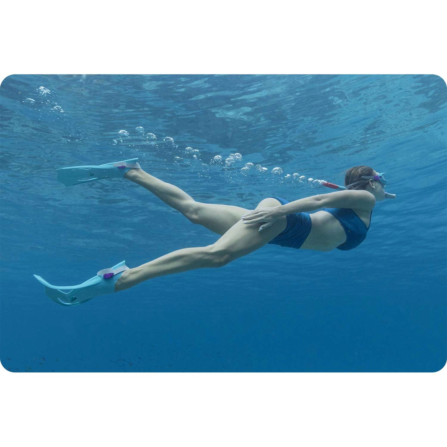 Dihalica je opremljena izduhnim (purge) ventilom za jednostavno izbacivanje vode i kapicom protiv valova za mirnije udisanje na površini. Kratke peraje s otvorenom petom i podesivim remenom osiguravaju siguran zaveslaj i ugodnu udobnost pri plivanju, a kompaktna duljina olakšava upravljivost i pakiranje za put.