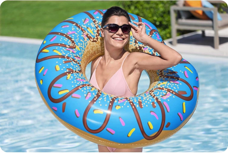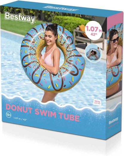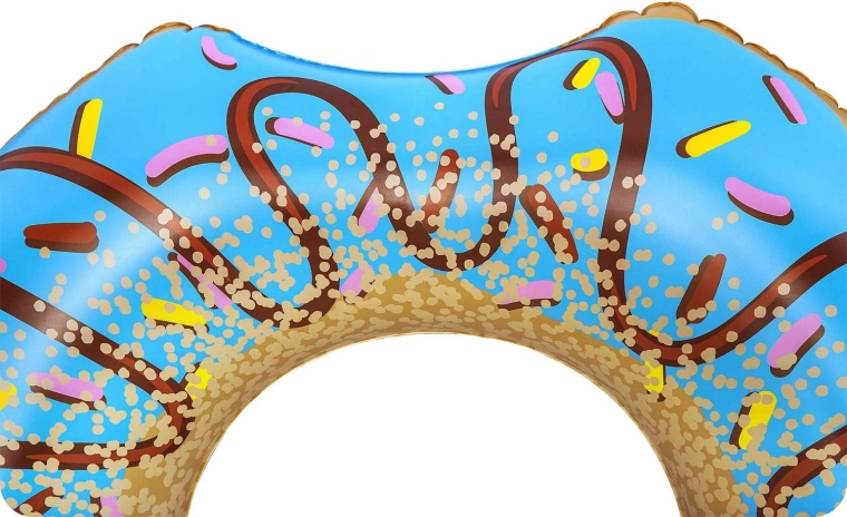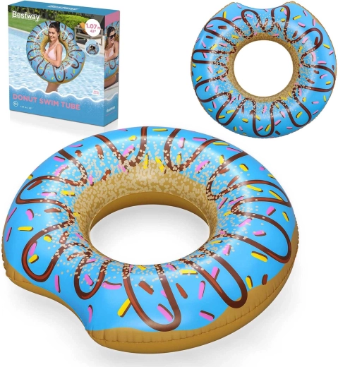 Uživajte u ljetu s razigranim napuhujućim kolutom u stilu ukusnog donuta promjera 107 cm. Zahvaljujući izdržljivom PVC materijalu kolut je čvrst, udoban i izvrsno vidljiv na vodi. Veliki promjer osigurava stabilno i udobno ležanje i za tinejdžere i odrasle, a u pakiranju se nalazi i zakrpa za popravak za bezbrižnu uporabu tijekom cijelog ljeta.