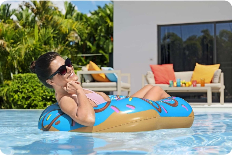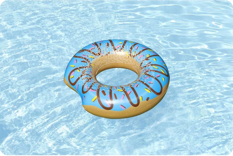 Stilski kolut s motivom plave glazure i šarenih mrvica privlači pažnju na plaži i uz bazen. Veliki unutarnji otvor i široki profil pružaju ugodnu potporu za opuštanje u vodi, dok glatka vinilna površina osigurava udobnost pri dodiru s kožom.