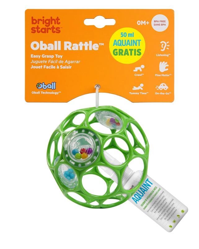 Omiljeno zvečkalo OBALL promjera 10 cm u boji seafoam donosi bebama od rođenja puno zabave i razvoj fine motorike. Zahvaljujući 29 otvora lako ga hvataju i najmanje ručice, izrađeno je od laganog i elastičnog materijala, a unutra ima 3 jasna zvečkala s raznobojnim perlicama za poticajne zvukove. U pakiranju je i AQUAINT 50 ml – 100% prirodna čista voda bez alkohola i mirisa, prikladna od rođenja, idealna za putovanja i svakodnevnu higijenu.