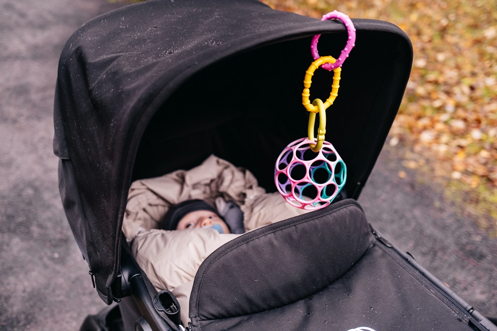 Zahvaljujući izdržljivoj izvedbi i lakom pričvršćivanju na sigurnosne prstene, loptica je savršena za dječja kolica ili autosjedalicu.