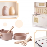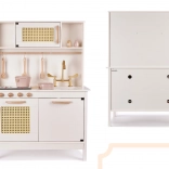 Ova drvena kuhinjica nadahnuta retro i boho stilom ističe se elegantnom kombinacijom bijele, krem i zlatnih detalja. Većina elemenata je od drva/MDF-a, površina je glatko brušena i obojena netoksičnim bojama za sigurnu igru. Okretni gumbi, vratašca koja se otvaraju i kukice za pribor potiču na istraživanje te uče djecu redu i organizaciji.