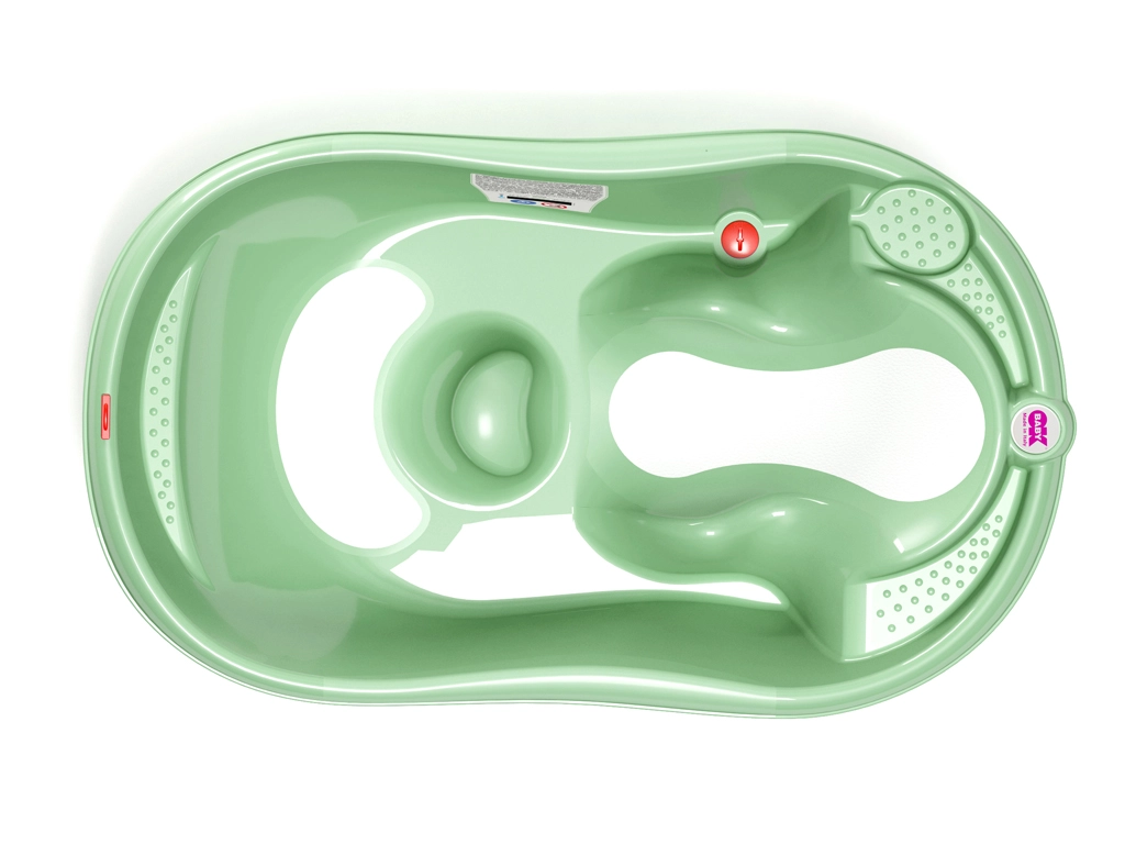 Kadica OK BABY Onda Evolution dizajnirana je za sigurno i udobno kupanje od prvih dana. Ergonomski oblik s integriranim naslonom prirodno podupire bebine tijelo, protuklizne površine povećavaju stabilnost, a termo indikator pomaže održati idealnu temperaturu vode 35–38 °C.
