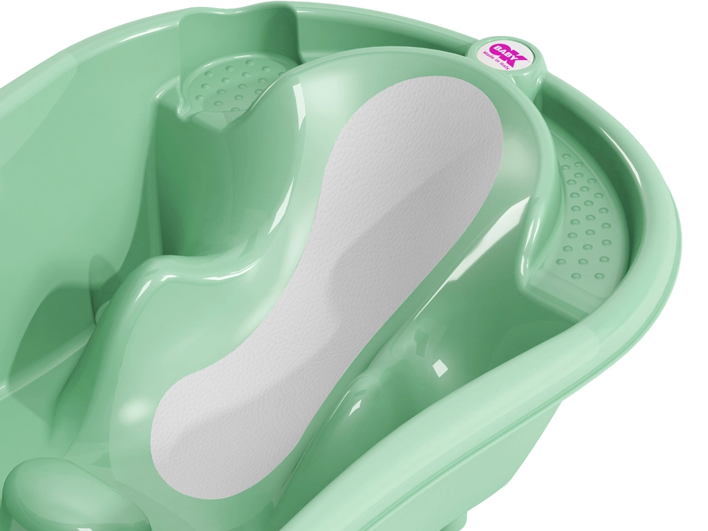 Ergonomska dječja kadica OK BABY Onda Evolution u mint boji nudi maksimalnu sigurnost i udobnost pri kupanju od rođenja do otprilike 12 mjeseci. Zahvaljujući dvjema položajima za ležeću i sjedeću bebu, protukliznim zonama i termo traci za kontrolu temperature vode, svako će kupanje biti jednostavno i mirno. Zaključivi ispusni ventil olakšava ispuštanje i sprječava neželjeno istjecanje vode.