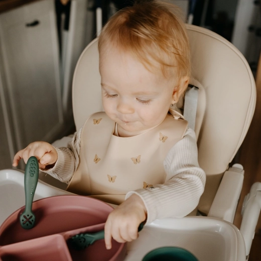 Silikonski podbradak Petite&Mars dizajniran je za lako i čisto prvo dohranjivanje i samostalno hranjenje. Ergonomski oblik, mekani i fleksibilni materijal te četiri razine podešavanja oko vrata jamče udobnost i sigurnost pri svakom obroku. Duboki džep učinkovito hvata hranu i tekućinu, pa odjeća dulje ostaje čista.