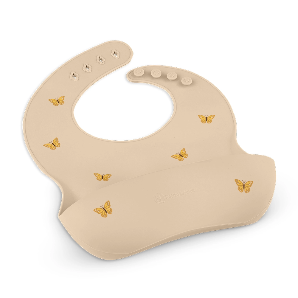 Silikonska podbradica Petite&Mars Take&Match u nijansi Sand s nježnim motivima leptira idealan je pomoćnik za prve kašice i samostalno hranjenje. Ergonomičan oblik i mekani silikon ugodno se prilagođavaju dječjem vratu, dok duboki džep učinkovito hvata padajuću hranu i održava odjeću čistom.