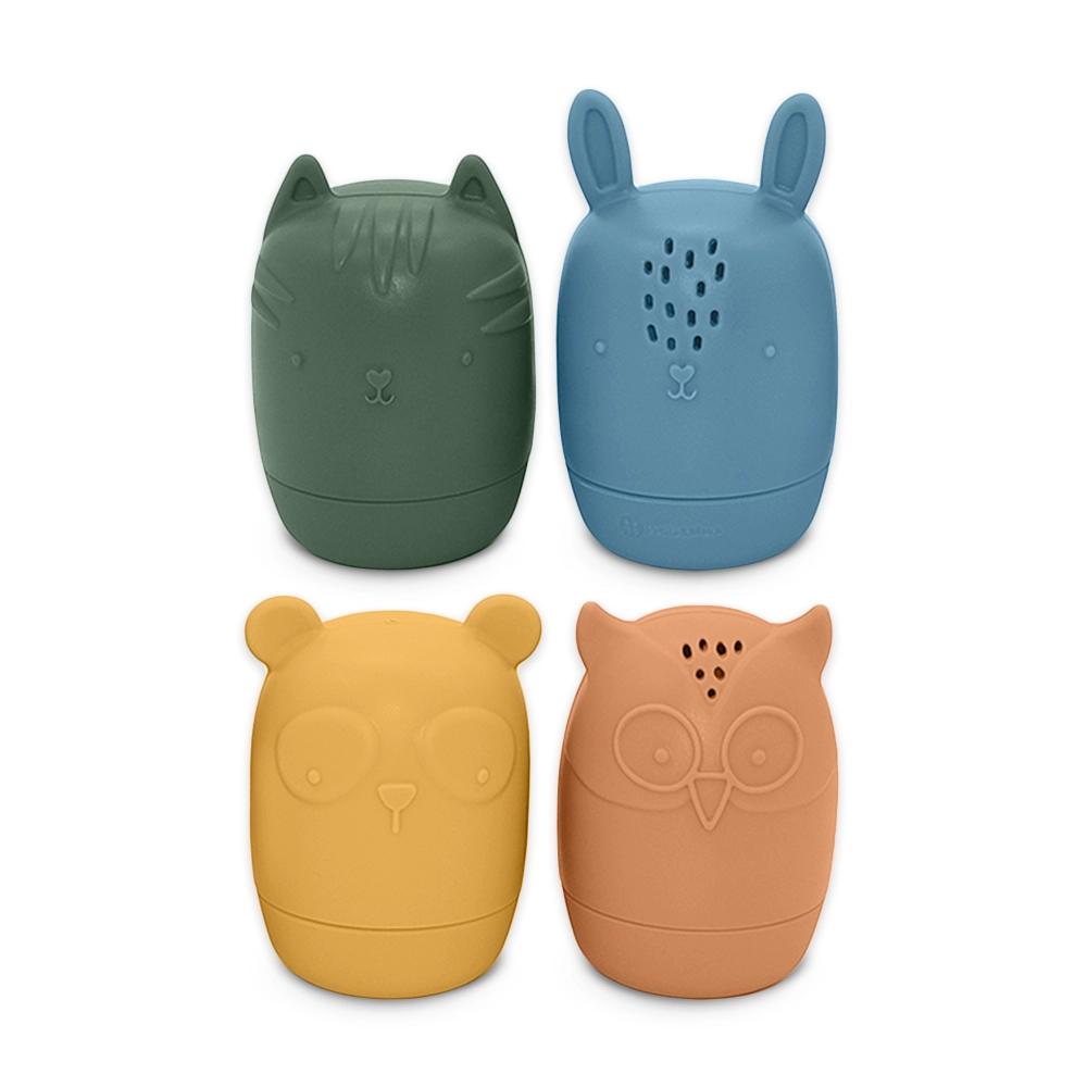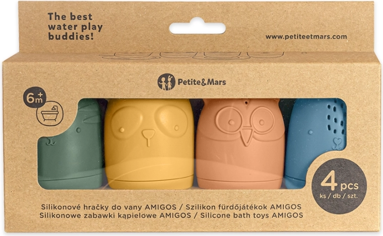 Otkrijte preslatke silikonske igračke za vodu Petite&Mars Amigos – set od četiri životinjice (sova, zec, mačka i panda) koje će djeca obožavati. Mekane su, vrlo lagane i izrađene od 100% silikona za prehranu bez BPA. Zahvaljujući otvorima za zahvaćanje i prskanje vode, kupanje se pretvara u zabavnu, osjetilnu igru te potiče razvoj fine motorike. Lako se rastavljaju i čiste – idealne za kadu, bazen i putovanja.