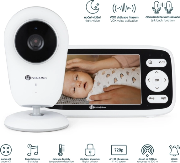 VOX aktivacija štedi bateriju, dvosmjerni zvuk umirit će bebu vašim glasom, mjerenje temperature prati udobnost, a 8 uspavanki s alarmom pomaže u režimu.