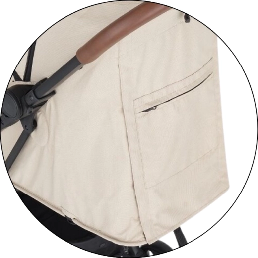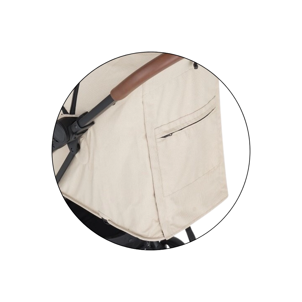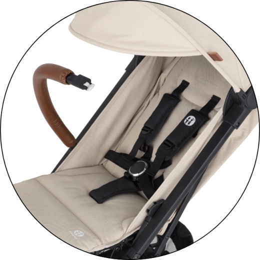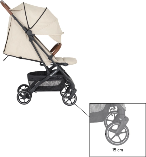 Prostrana produživa nadstrešnica sa šiltom učinkovito štiti od sunca i vjetra. Po vrućini ćete cijeniti mrežasti prozorčić na nadstrešnici i veliku stražnju ventilacijsku mrežicu nakon izvrtanja navlake. Roditelje će obradovati odvojiva zaštitna prečka za brz pristup djetetu, rukohvati od eko-kože za ugodan hvat, praktičan stražnji džep za sitnice i prostrana košara za kupovinu. U kompletu je i držač za napitke.