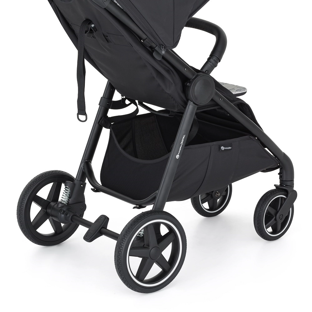 Gumena kotača sa stilskim bijelim rubom i amortizacijom osiguravaju stabilnu vožnju i na neravninama te ih ne ugrožavaju probušene gume. Čvrsta aluminijska konstrukcija, središnja kočnica i kvalitetni nosači kotača jamče sigurnost, dok velika košara za kupnju i torba za presvlačenje olakšavaju svakodnevne šetnje. Kolica rastu s obitelji – krošnja se može lako zamijeniti drugom bojom (kompatibilno s Royal2/Royal3).