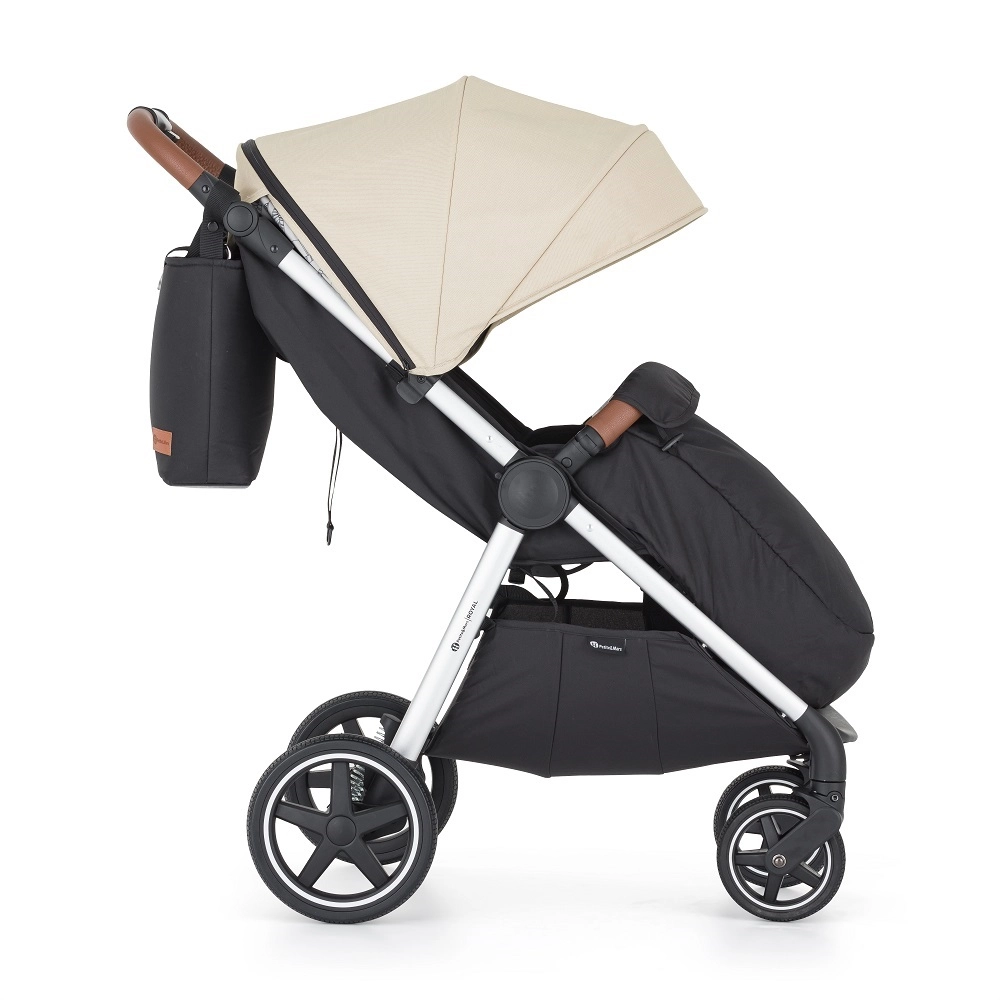 Elegantna sportska kolica PETITE&MARS Royal 3 u srebrnoj izvedbi s bež krovićem nude stabilnu vožnju bez rizika od probušene gume zahvaljujući punim gumama, panoramsku ventilaciju za udobnost ljeti i sklapanje jednom rukom za brzu manipulaciju. U kompletu su torba za previjanje, navlaka za noge i produženi krović sa SPF 50 za maksimalnu zaštitu.