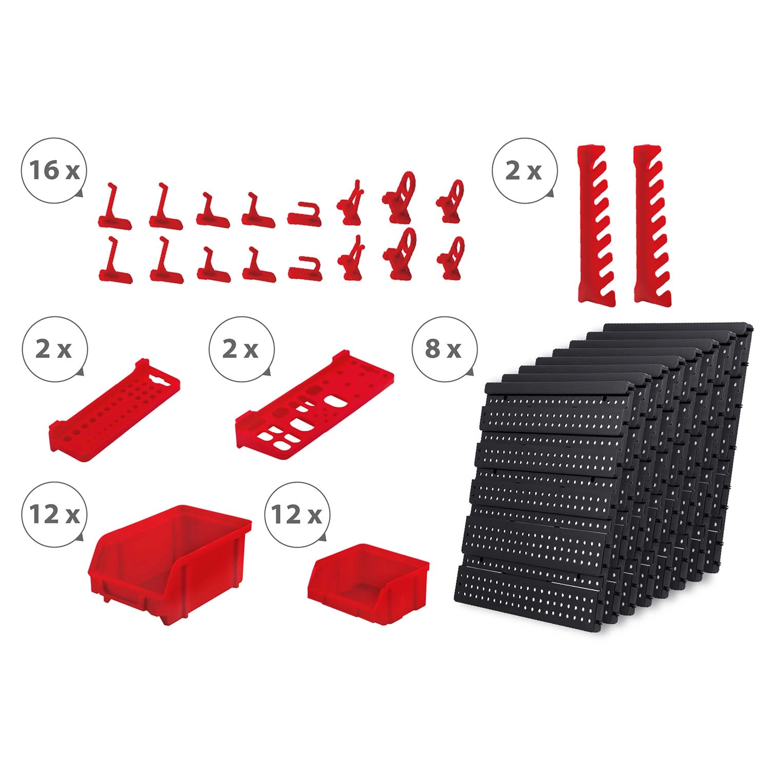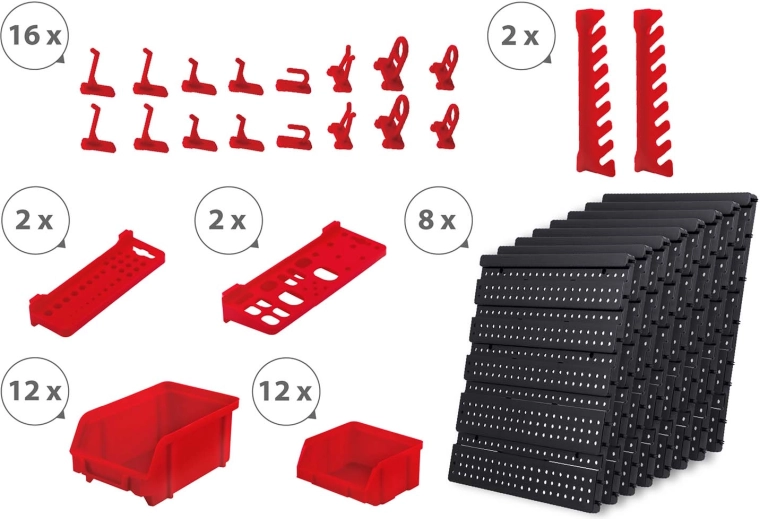 12 malih i 12 velikih kutija za vijke i tiple, 16 kuka i držača plus 2 držača za ključeve – lako razvrstavanje i brz pristup.