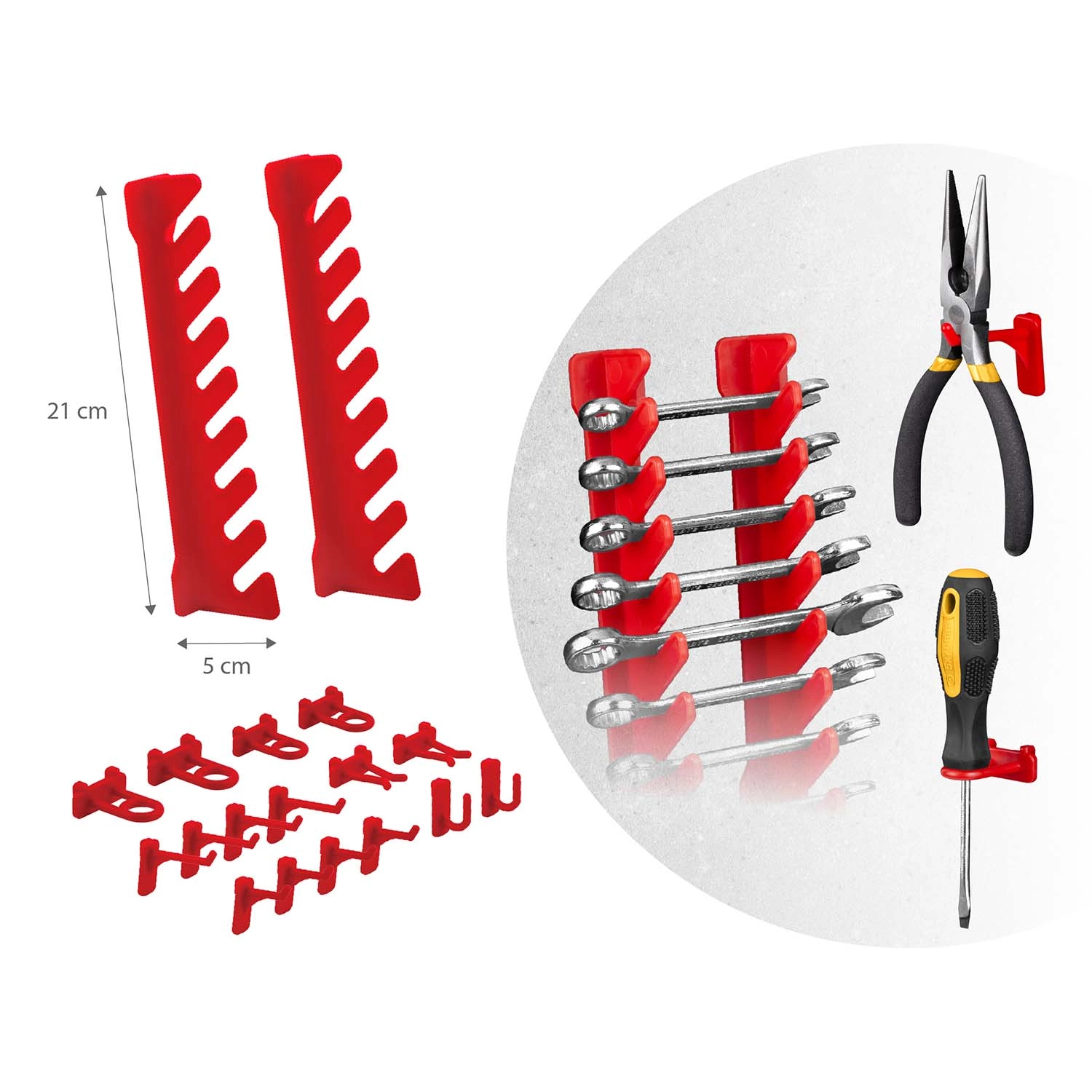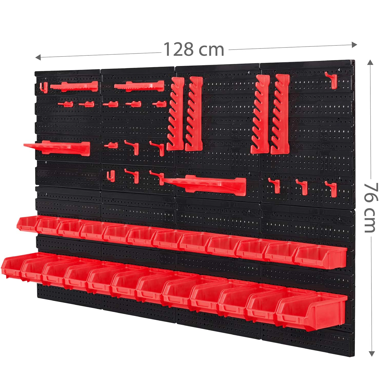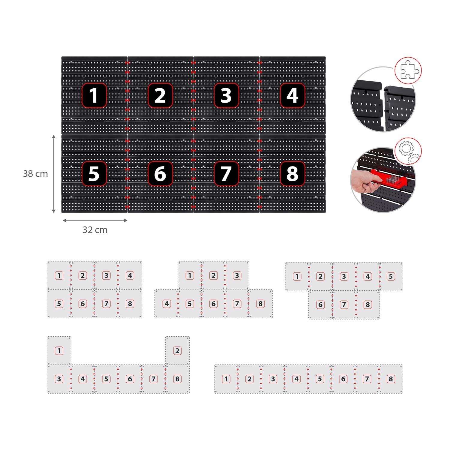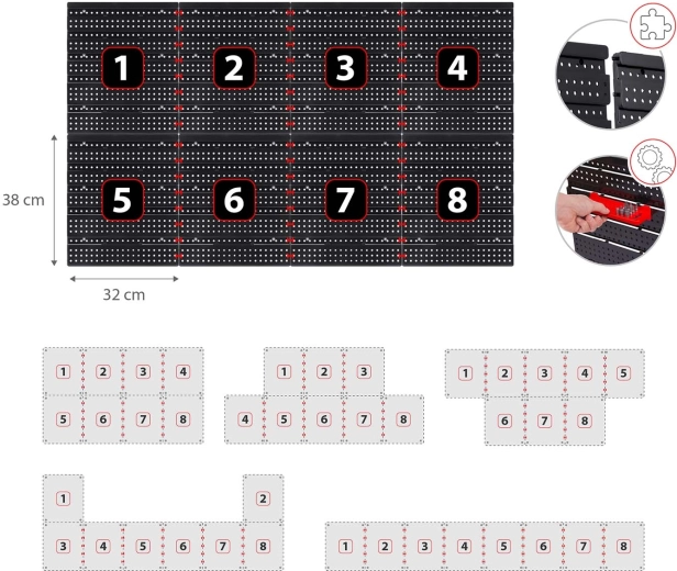 Sadržaj seta: 6 modularnih panela, 12 malih kutija (9,5 × 10 × 5 cm), 12 velikih kutija (16 × 10 × 7,3 cm), 2 police 23 × 9 cm, 2 police 17 × 5 cm, 16 držača i kuka, 2 držača za ključeve te montažne tiple za razne podloge (beton, cigla, drvo, lim). Montaža je brza i intuitivna – elemente jednostavno učvrstite u perforaciju i po potrebi prerasporedite.