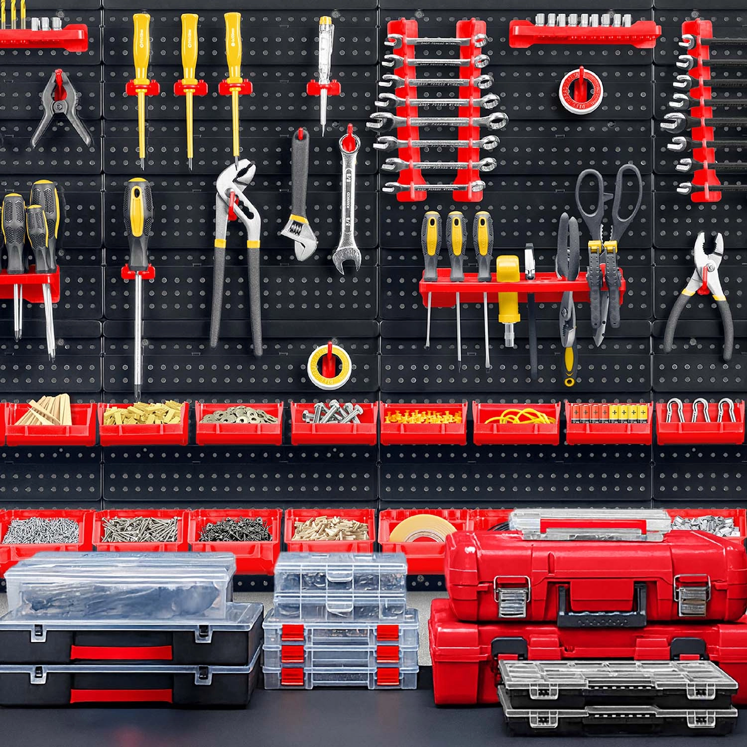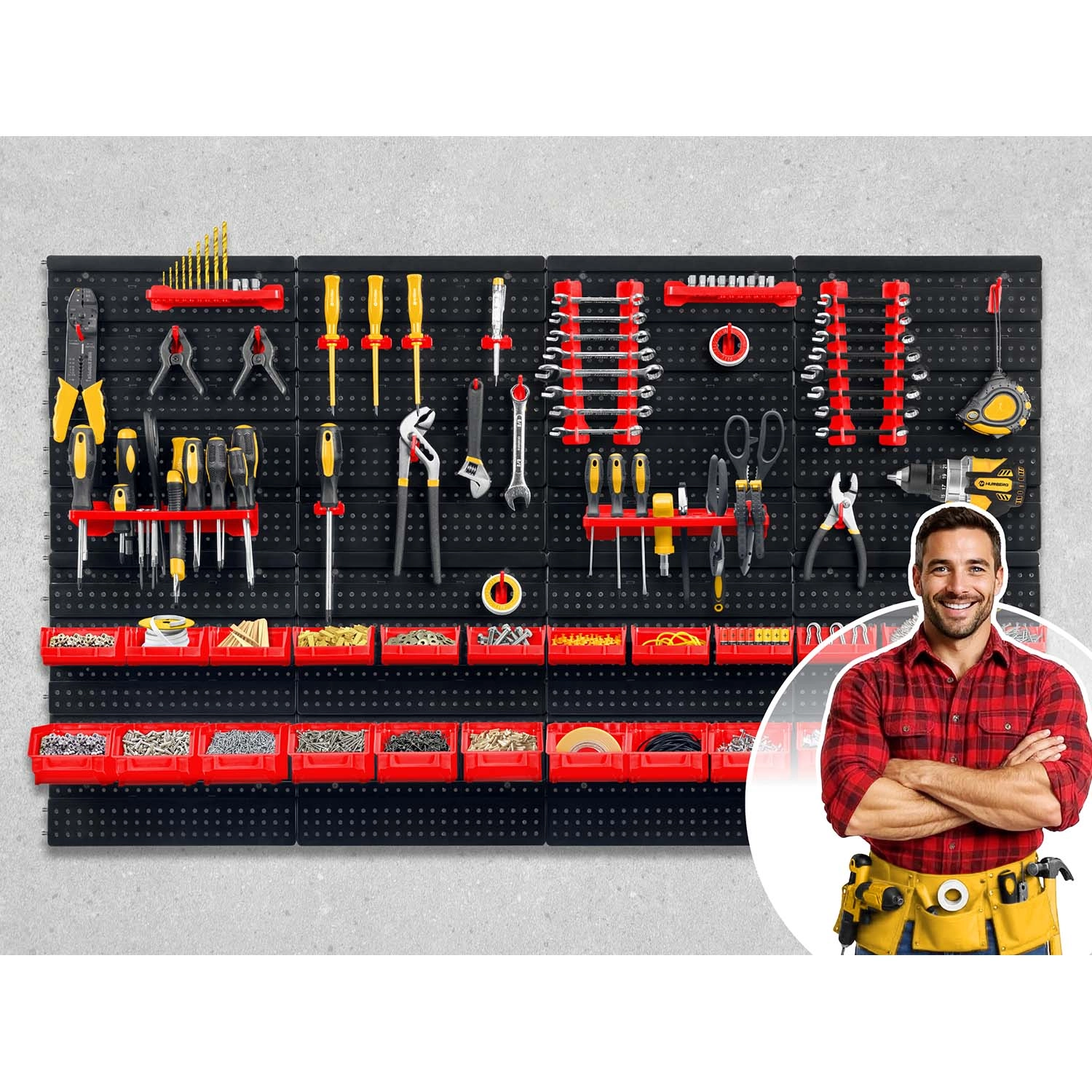 Modularni sustav pegboard panela HUMBERG pretvara svaki prostor u savršeno organizirano radno mjesto. Kombinacija svestranih kuka i držača, kutija u dvije veličine i praktičnih polica osigurava da su odvijači, kliješta, bitovi, svrdla i spojni materijal uvijek pri ruci. Robusni perforirani paneli podnose svakodnevnu uporabu, a zahvaljujući pametnoj raspodjeli elemenata ploču ćete lako prilagoditi svojim navikama.