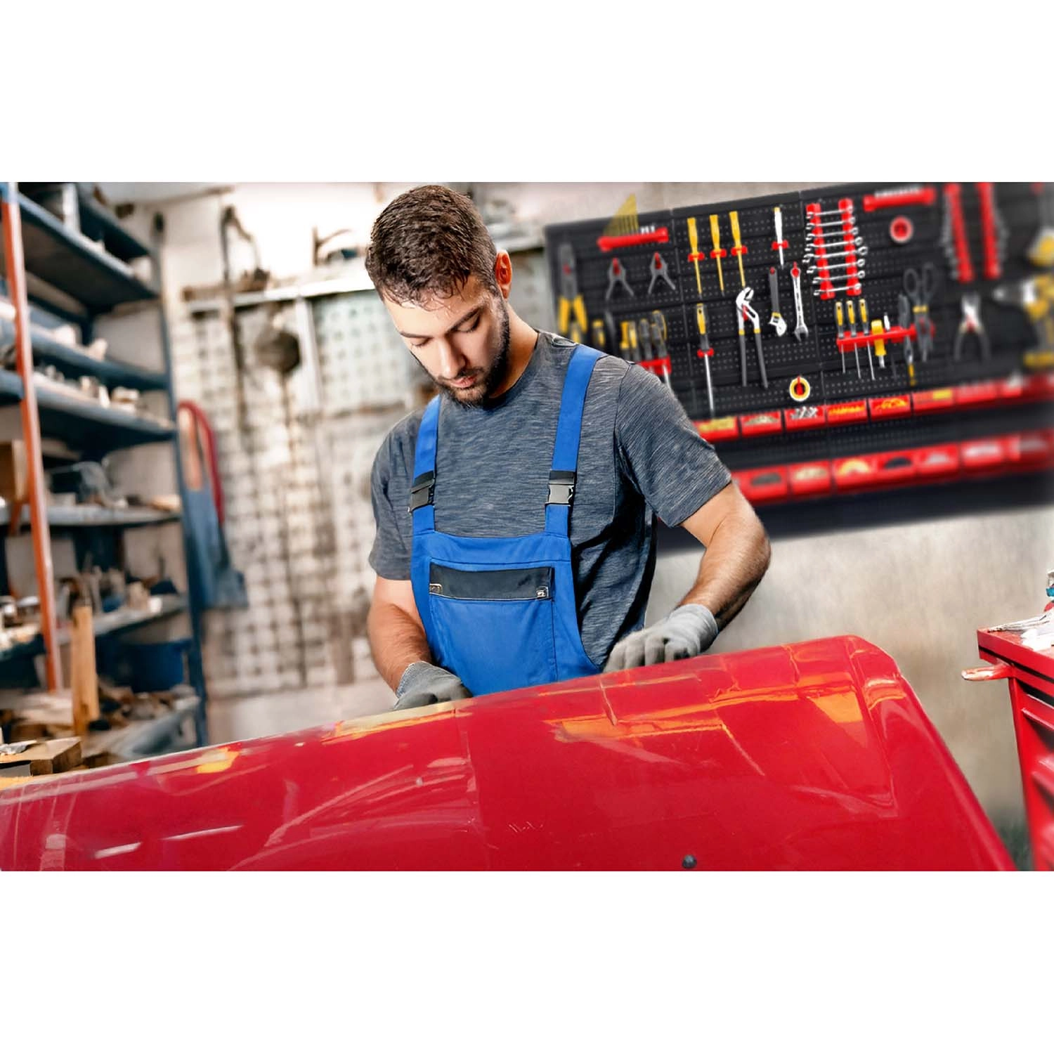 Šest perforiranih panela i 54 dodatka omogućuju pregledno odlaganje ručnog alata, nastavaka i sitnih dijelova, uvijek nadohvat ruke.