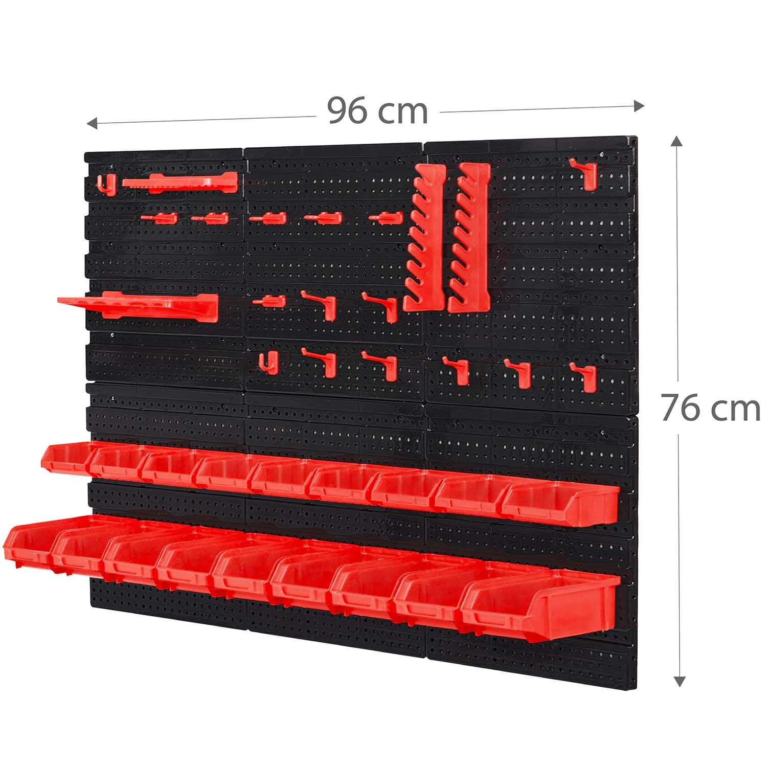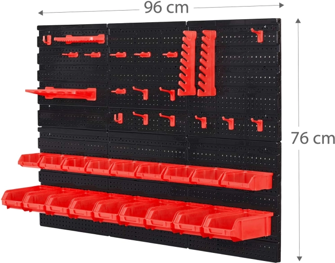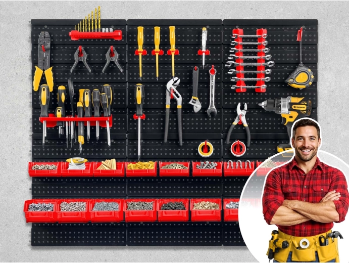 Održavajte savršen red u svojoj radionici sa zidnom pločom za alat HUMBERG dimenzija 96 × 76 cm. Modularne ploče, čak 43 praktična dodatka (kutije, kukice, police i držači) i čvrste perforirane ploče osiguravaju pregledno spremanje vijaka, bitova i ručnog alata. Jednostavna montaža, slobodan raspored pribora i izdržljivi materijali jamče dugi vijek trajanja kod kuće i u profesionalnom servisu.