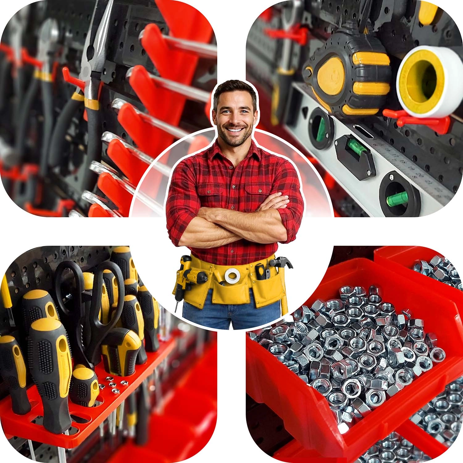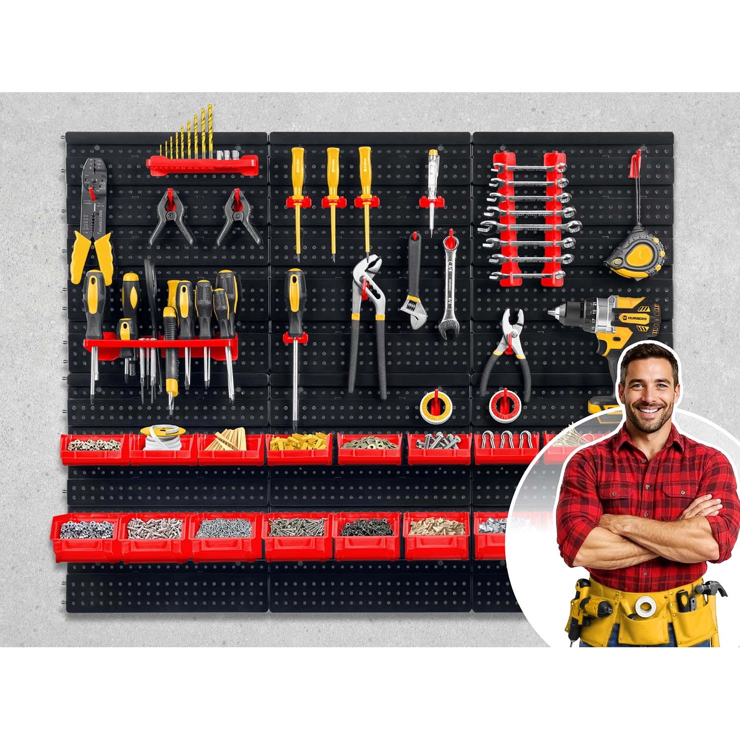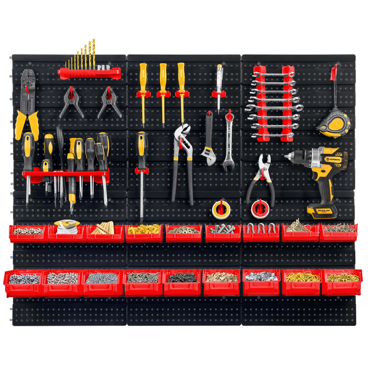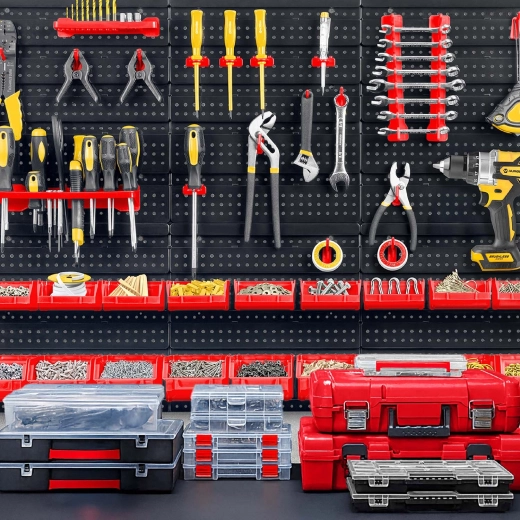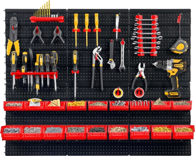 Kompletni zidni organizator HUMBERG nezamjenjiv je pomoćnik za svaki servis i kućnu garažu. Zahvaljujući modularnom sustavu perforiranih panela lako ćete složiti raspored točno prema svojim potrebama. Čvrste kukice, držači i police drže odvijače, kliješta i ključeve, dok različite veličine kutija pregledno razvrstavaju spojni materijal.
