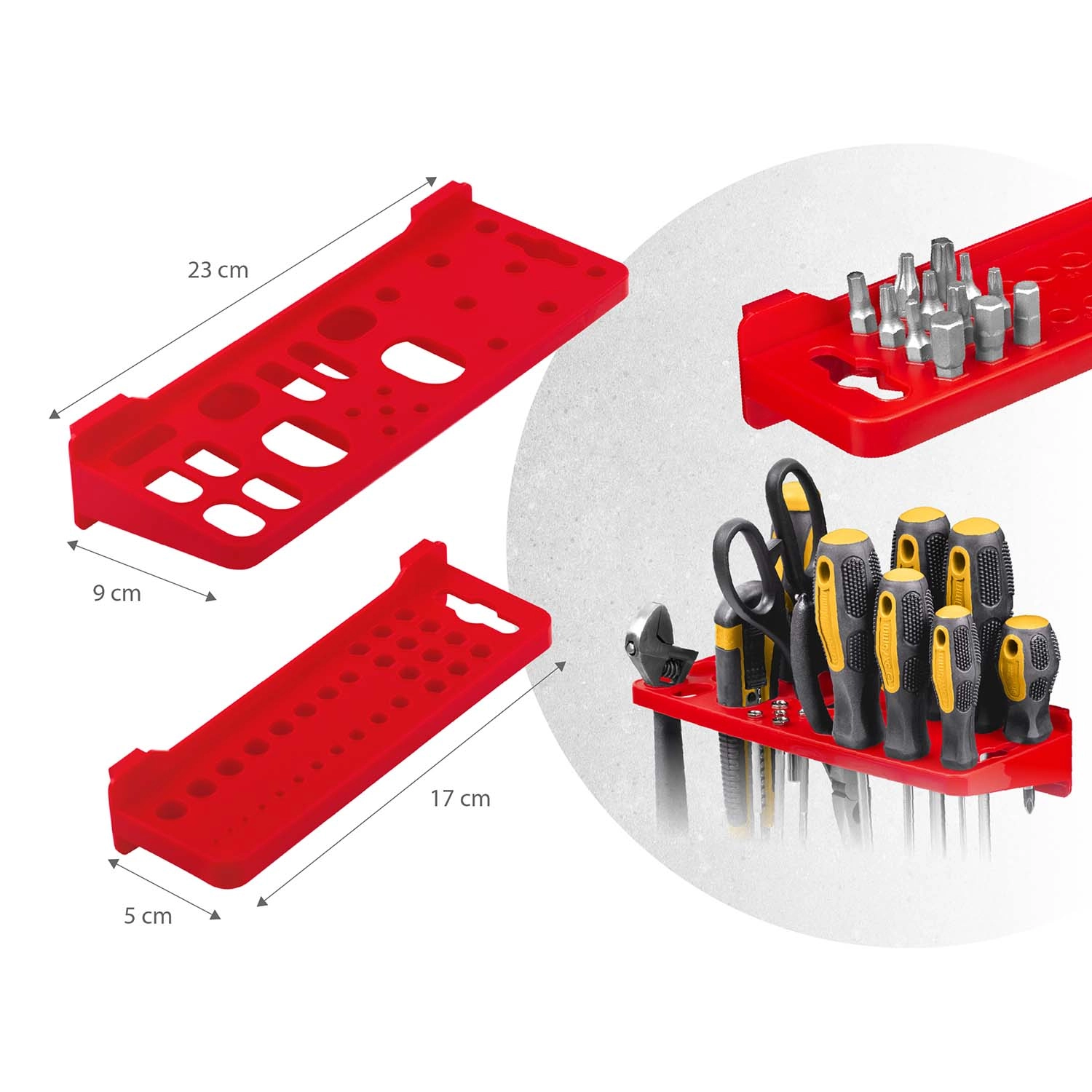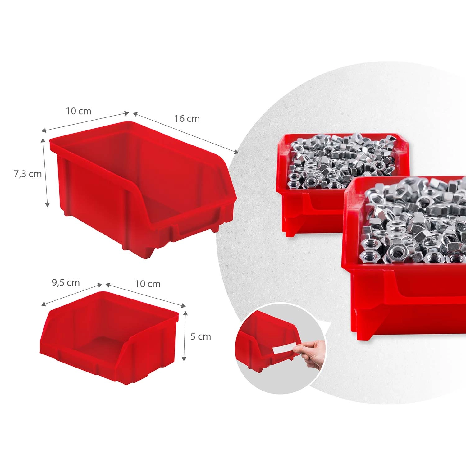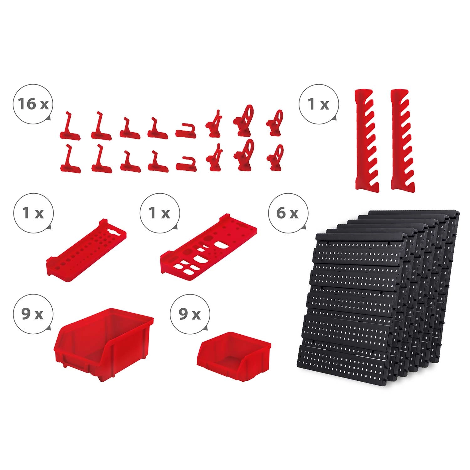 18 kutija u dvije veličine, dvije odlagalne police te set kukica i držača osiguravaju pregledno razvrstavanje spojnog materijala i sigurno odlaganje alata.