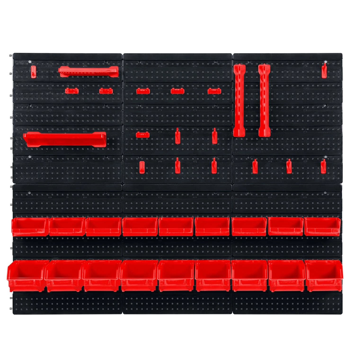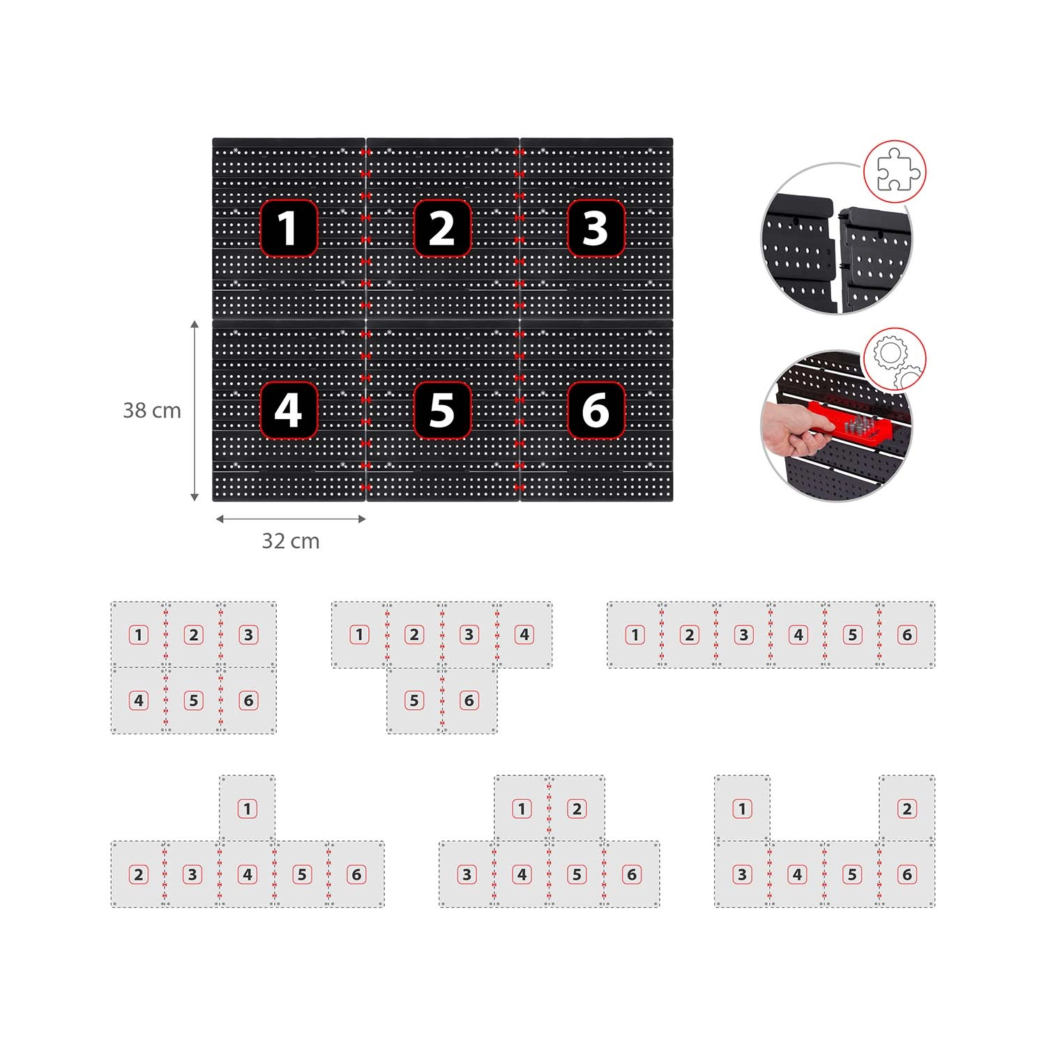 Šest perforiranih panela i 43 dodatka omogućuju vam organizirati alat točno prema vašim navikama – od kliješta i odvijača do svrdla i bitova.