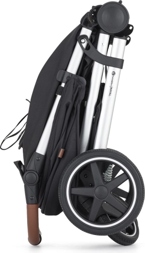 Ručka i braník od smeđe eko-kože, velika košara, navlaka za noge i torba za prematanje u pakiranju. Sklapanje jednom rukom prema unutra održava presvlake čistima.