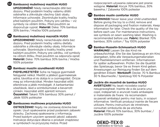 Zečić Hugo vjeran je pratitelj za mirno uspavljivanje od prvih dana života. Lagani, prozračni i nevjerojatno mekani materijal od bambusovih vlakana i pamuka pruža bebi osjećaj sigurnosti i nježnosti. Zahvaljujući kompaktnim dimenzijama 34 × 30 cm savršeno pristaje u ručicu, mazi se i lako stane u kolica ili krevetić.