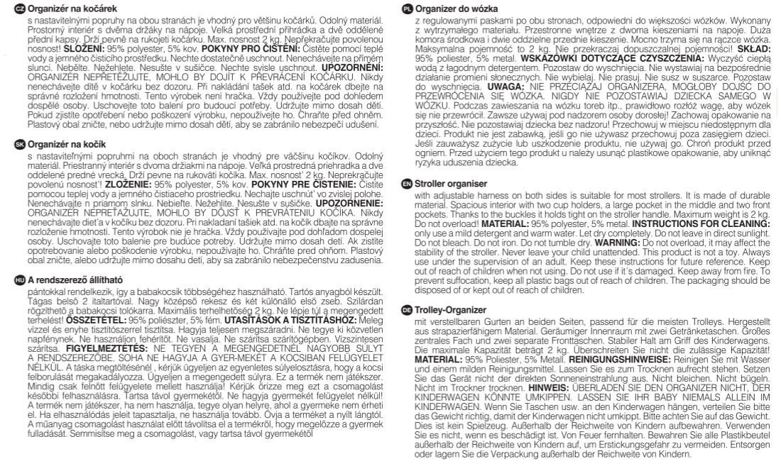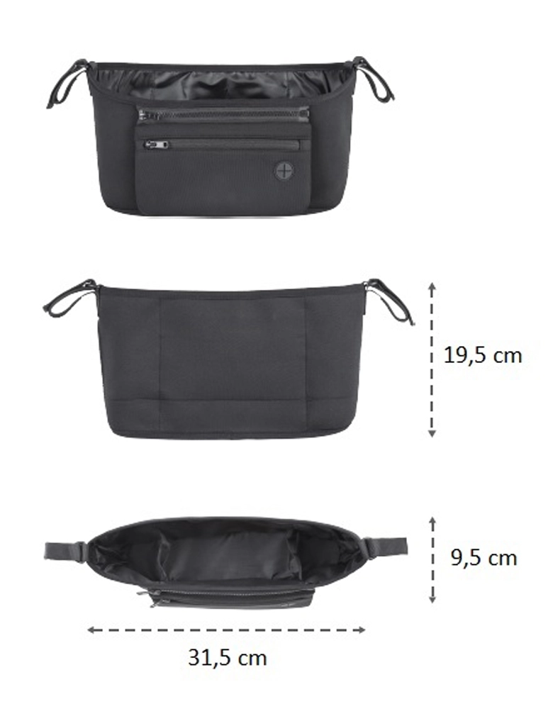Montaža je brza i pouzdana – trake s čičkom osiguravaju čvrsto pričvršćivanje na bilo koju vrstu kolica. S maksimalnom nosivošću od 2 kg organizator je dizajniran da ostane stabilan i ne smeta pri vožnji. Elegantni crni dizajn pristaje svakim kolicima i drži vaše stvari pregledno organiziranima bez potrebe za dodatnom torbom.