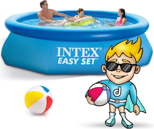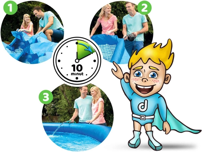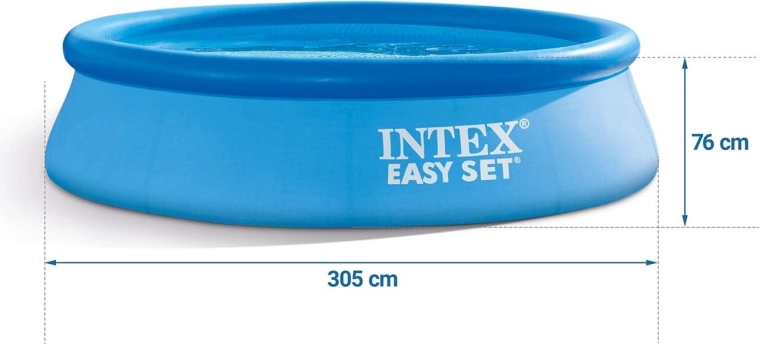 Praktični kružni bazen INTEX s napuhujućim gornjim rubom možete postaviti za nekoliko minuta – dovoljno je razvući podlogu, napuhati obruč i napuniti vodu. Kvalitetna troslojna konstrukcija s najlonskom ojačom je otporna na trganje, a unutarnja površina s mozaik uzorkom djeluje čisto i privlačno.