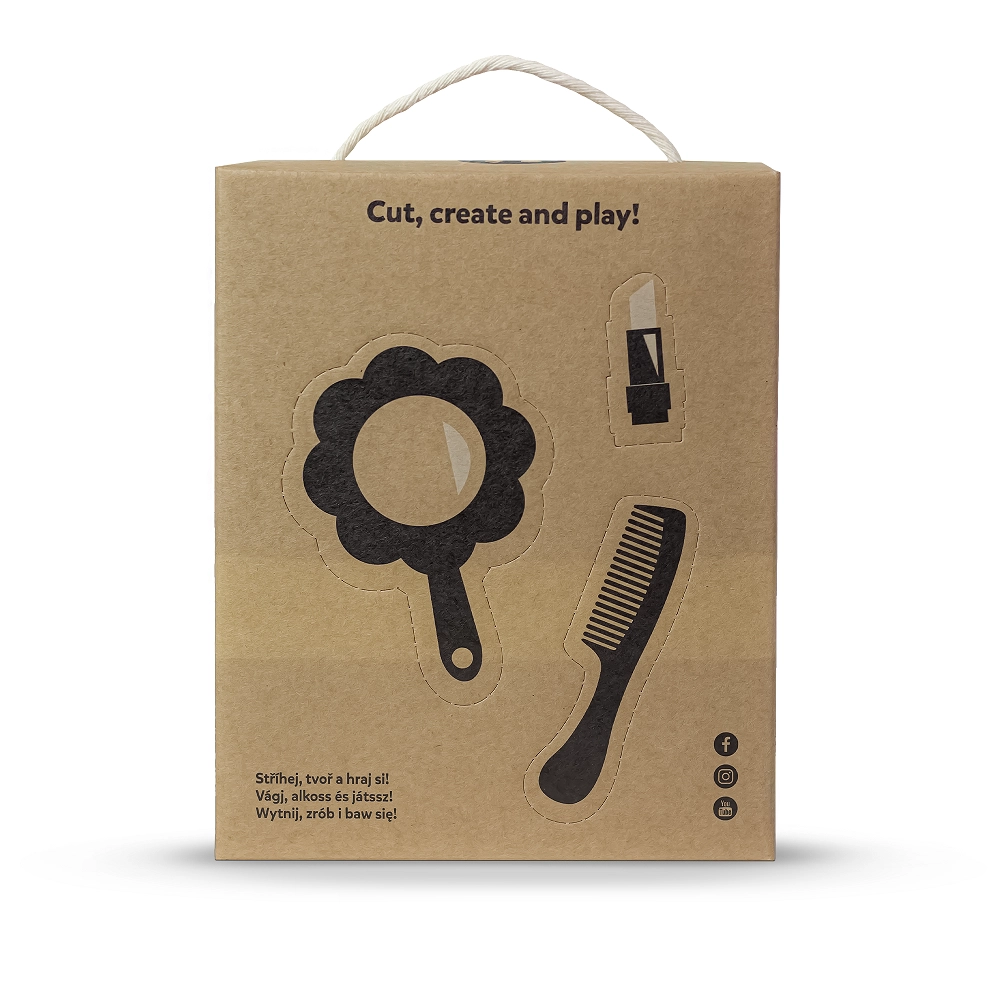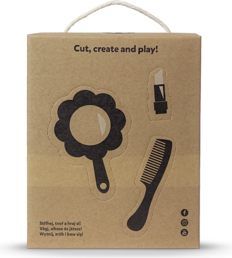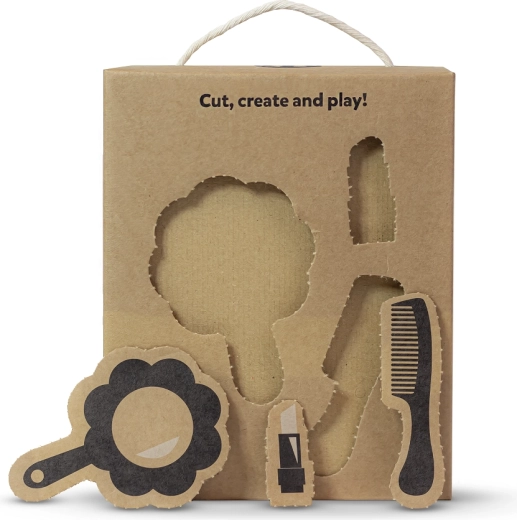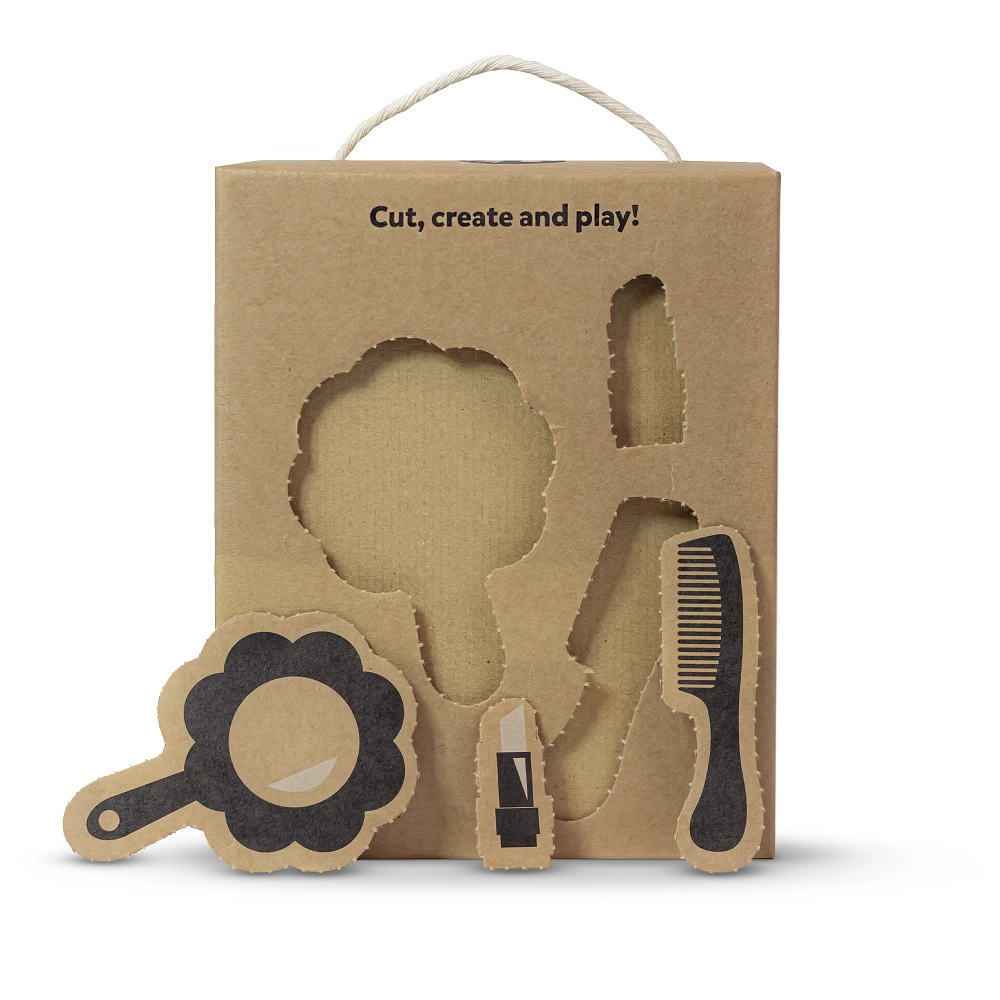Ambalaža s natpisom „Cut, create and play!” skriva kreativne kartonske dodatke – ogledalce, češalj i druge – za još zabavniju igru.