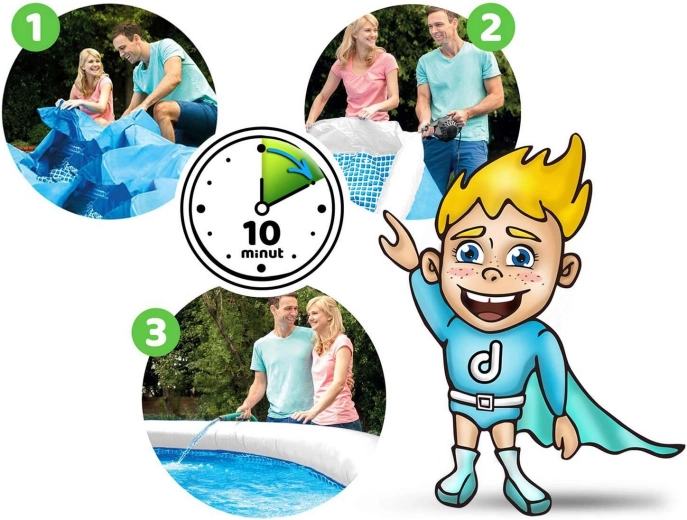 - Jednostavna instalacija – razvući podlogu, napuhati obruč, napuniti vodu.