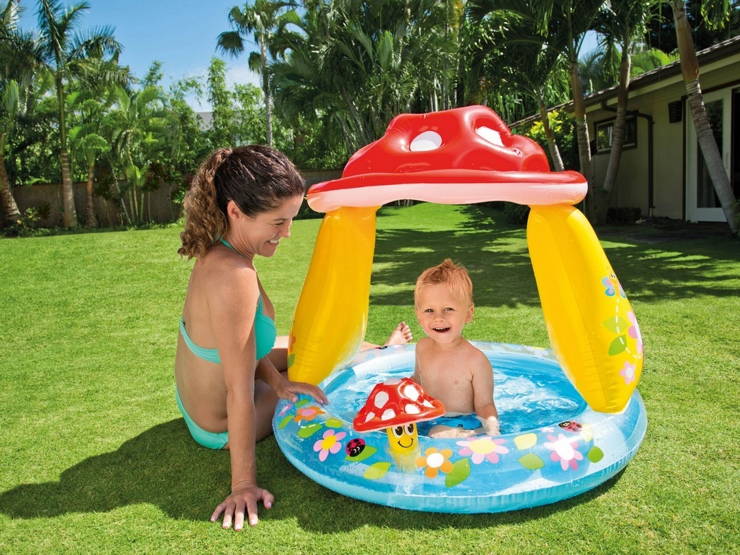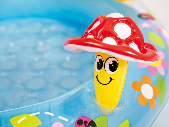 Razveselite djecu sigurnim vodenim kutkom u vrtu ili na terasi. Bazen INTEX s veselom grafikom cvijeća i prepoznatljivim gljivastim nadstrešnicom pruža sjenu u vrućim danima i ugodno okruženje za prve vodene radosti. Zahvaljujući mekom, teksturiranom podu mališani se osjećaju udobno i stabilno.