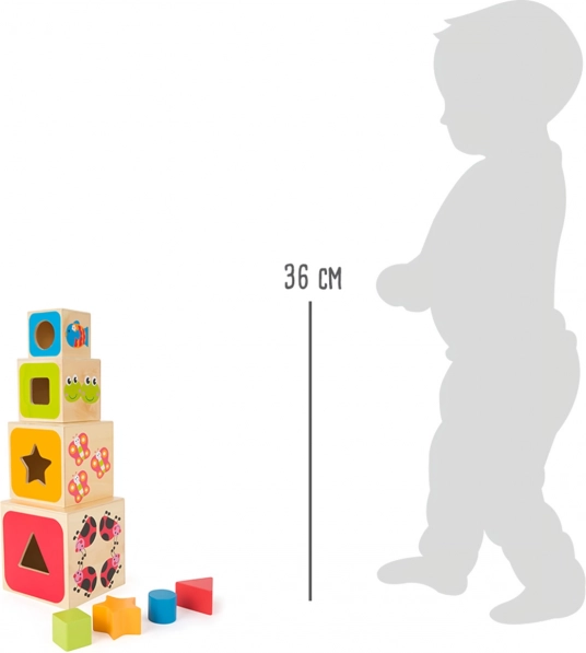 Svaka je kocka ukrašena veselim motivima životinja i izraženim bojama koje potiču na otkrivanje. Precizni otvori vode djecu ka strpljenju i koncentraciji, a slaganje tornja podržava stabilnost ruke i prostornu maštu. Kvalitetan drveni materijal ugodan je na dodir i izdržljiv za svakodnevnu igru.