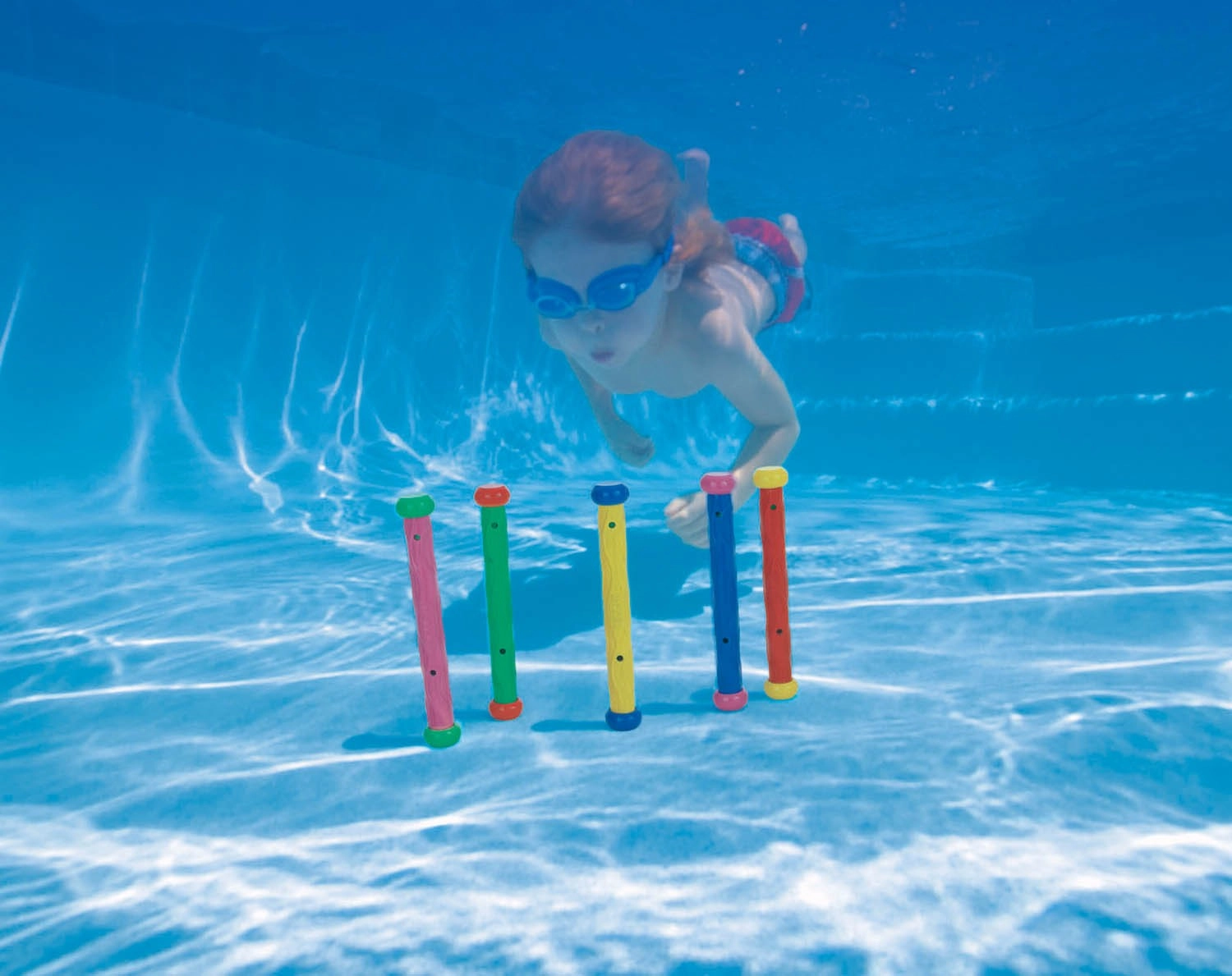 Set potapljačkih štapova Intex idealno je pomagalo za prve korake u vodi i zabavna natjecanja. Zahvaljujući elastičnom i sigurnom materijalu ugodno leže u ruci i pogodni su za višekratnu upotrebu u bazenu.